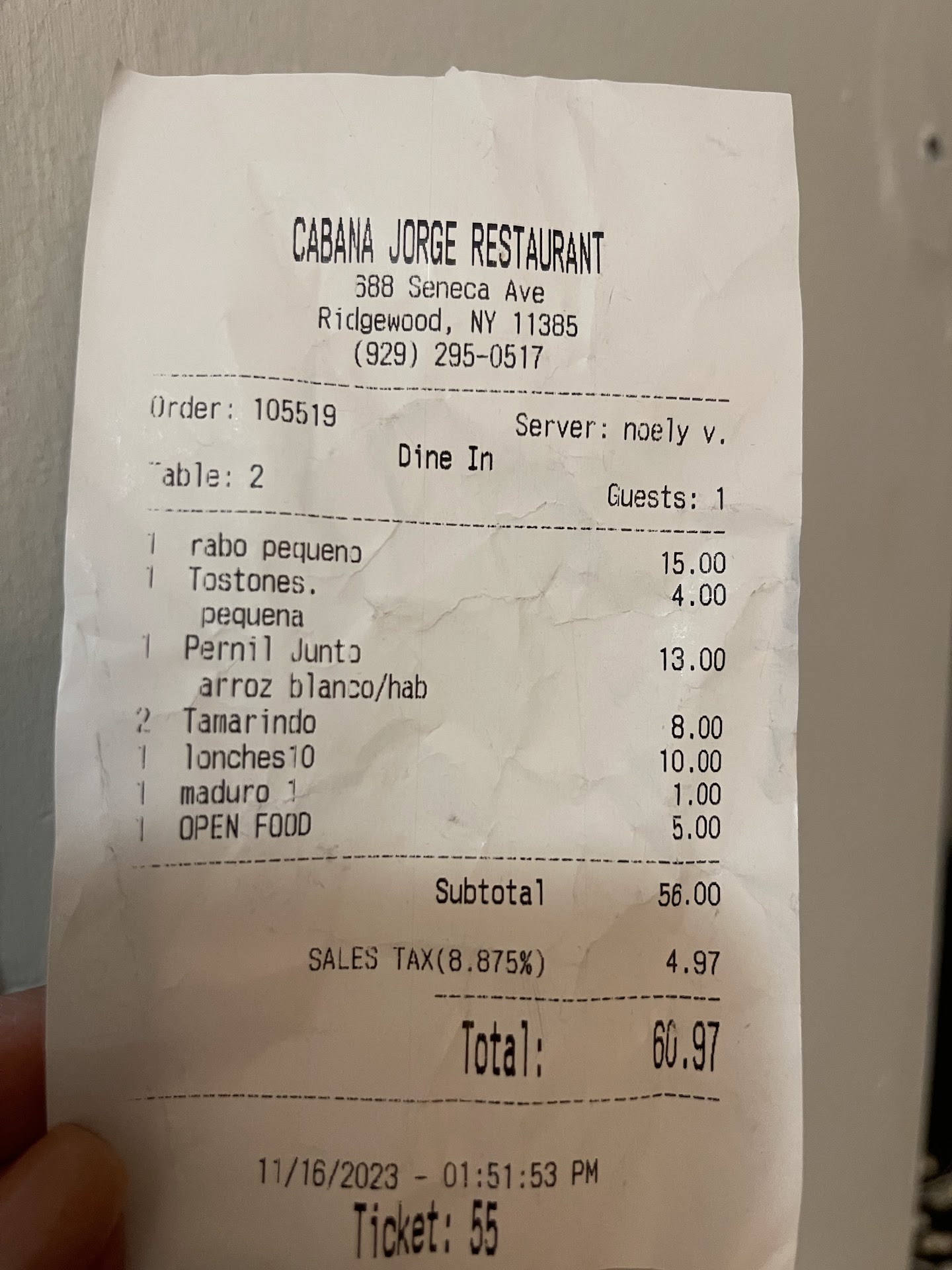 Read moreThe Food was good, I can’t take that away HOWEVER I ordered rabo and their portion its $15. I was good with the price since I know rabo its not cheap. When I checked the receipt (see the picture) I saw they charged $5 fee for “Open food” I thought it was a mistake charge, when I asked one of the ladies explained that the charge for open food its when you order something from the menu and not from the food that its already prepared. SO BE AWARE, IF YOU ORDER ANYTHING FROM THE MENU, YOU WILL BE CHARGED SOME NONSENSE $5 in addition to the price of the food. Jorges used to be good, the people would come here for the good environment, good service, good food, and reasonable prices. Its time to find another good spot in the neighborhood. Won’t be coming here again, you lost a customer as of today for some nonsense charge that I never heard of. I don’t like funny places that have hidden fees. Now they have some new young girls that are rude and act like you come to ask...