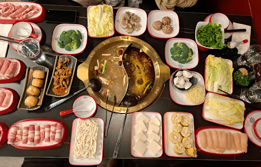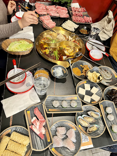 Read moreThis place is minimum $40 per person for dinner, then $16 more if you want 2 broths- we ended up spending $70 each (with tip) for an average meal in an average ambiance. It's on us, but we didn't see that the only option was "all you can eat". We arrived in the dark and didn't see the sign outside, and it was not clear in the online ordering app. In fact, the only totaled items on the bill in the app were the broths and the soft drinks, no mention of the $80 base price for two people. As long as diners know that, I would say my food was delicious even if it's pricey (though my friend ordered the beef tallow broth at minimum spice level and literally could not eat it). It's a classic hotpot experience with music videos blaring on the TV. The people who work here are very nice, but we had a bunch of questions about the food, ordering, and the bill, and they didn't speak or understand any English, so unless you've been there before or speak their languages, you might have trouble navigating. In summary, if you're craving hot pot in the area and have some extra money to spend, it's a good spot, but there are much cheaper and nicer places in Chinatown...