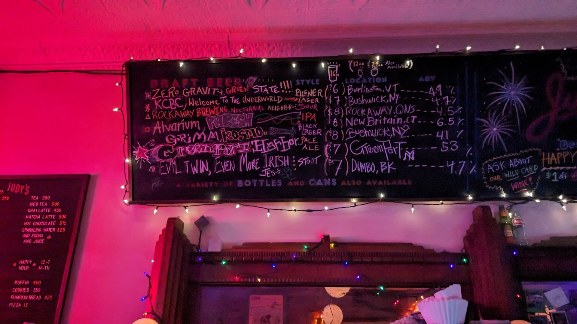 Judy's stands apart in an age where every coffeeshop looks like the same IKEA showroom and every bar has more TVs than tables. People say it's the hipster bar in town. Idk, I guess for Sunset Park standards it is? But I could roll out of bed and into Judys with my PJs with no shame. And in the evenings, the bar has that familiar flair of late nights in your high school best friend's attic.
