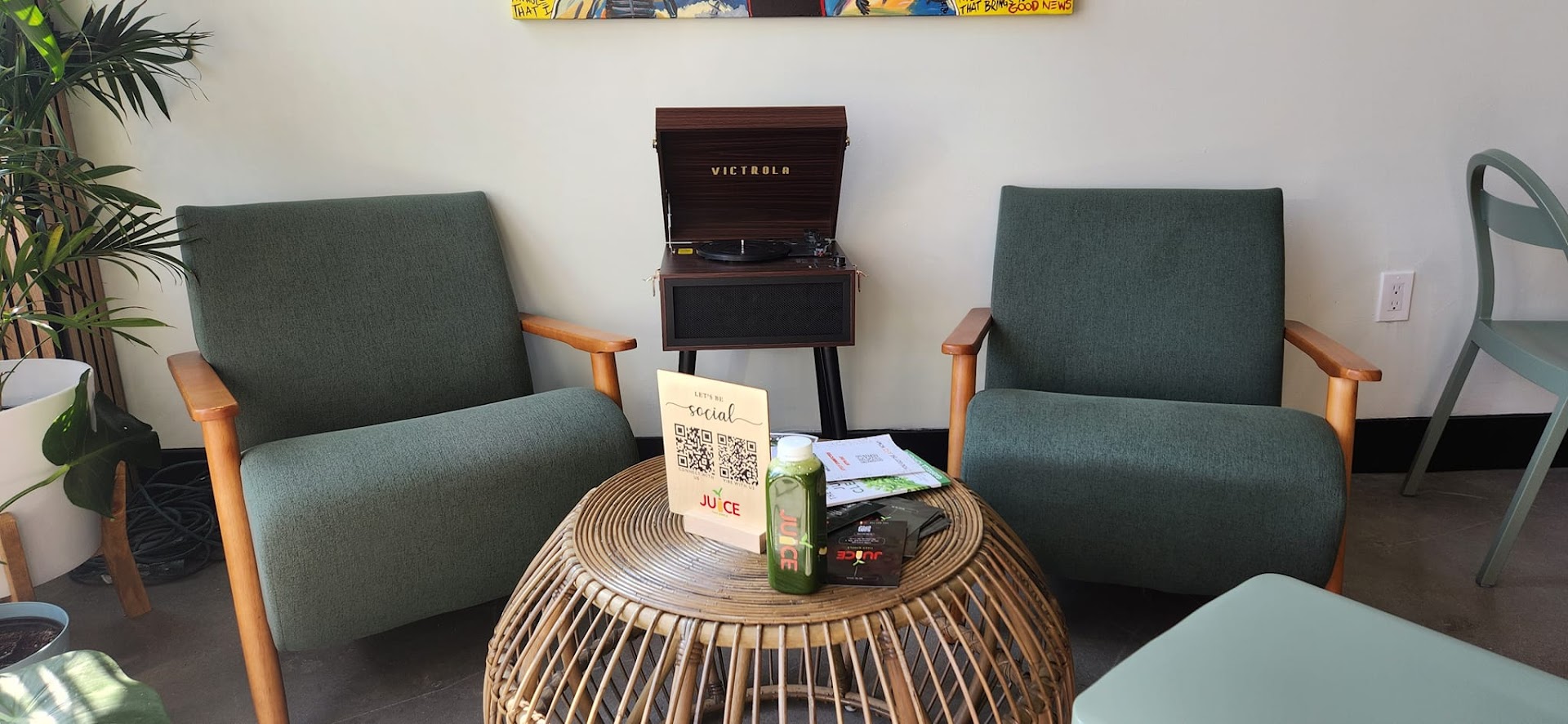 Read moreCame with my friend after graduation and was immediately greeted with smiles. Ordered a smoothie and a pressed juice, both tasted great and refreshing! To add on, they have a great selection of dairy free milk alternatives! They have almond, coconut, oat and something else I forgot lol. But nonetheless, place is clean and you have comfortable chairs to chill and come with a friend. They also supply some board games as you wait even though the wait isn’t long. The kind woman took about 7 min to make 4 drinks. Bathroom is clean and I loved the inspirational messages written across the walls. Will definitely come back! 🫶🏻