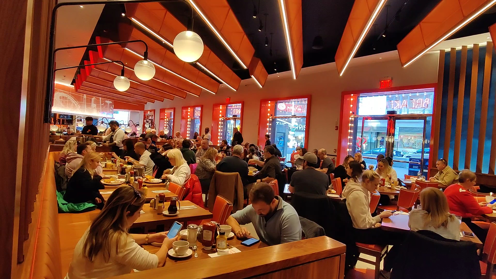 Read moreI'm a little ambivalent about this place... Let's start with the positives: Location is pretty strategic near the Times Square and not too far from Central Park South either The decor works! Somehow. I mean it's bright and some may even say a little gaudy but that's the point! It has this classic 70s or 80s diner look with bright orange bold lines and big letters, i love it. The servers were nice and accommodating Pancakes were standard but done right, they'll even give you some chocolate syrup for dipping if you ask We asked the bacon to be extra crispy, and we got it. It was done to near-death and really crispy, just the way my kids like it If you come early enough, you'll get seated right away. They're open at 7am and we got there around 8:30am and there were open seats. However by around 9am the line was starting to form so just come early
