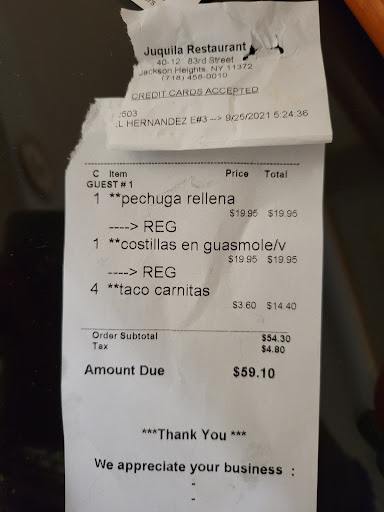We ordered 3 appetizers and the person over the phone took down the incorrect address. Left my number so they can review their system after clearly giving my address in the J.Heights district. Also ordered food last week which led us to choose Juquila over Itās competitors Coatzingo, Molcajete, El Poblano etc. Somehow the poor delivery guy was sent to long island city. It would be common sense why would you send a courier for over 40 blocks for a delivery. 34th avenue is well known in the area . 55 minutes later I give the manager the correct address only to be passed to the server who wrote the order for me to reiterate the same address and phone number. I want to support a small business and you would think they would accept their error and offer at least a 50% discount or a comped meal considering the lateness but what we received was cold food. Not sure how customer service oriented the Manager is willing to accept errors like these. Pretty disappointed with the delivery and honestly will rethink ordering a delivery from here again. I do recommend to eat in person if in the area but even that last time we went there the waitress didnāt know how to make the cocktails but the food is good. Hopefully they learn on customer service and how to rectify this situation in the future. A cold taco and queso fundido with chips and guacamole is not turning my night around. Tipped the guy well for his efforts in the cold weather. Paying full price is throwing your money away considering the other authentic restaurants in Jackson Heights. Iām glad I didnāt have friends over while we watched lucha libre, saved myself the...