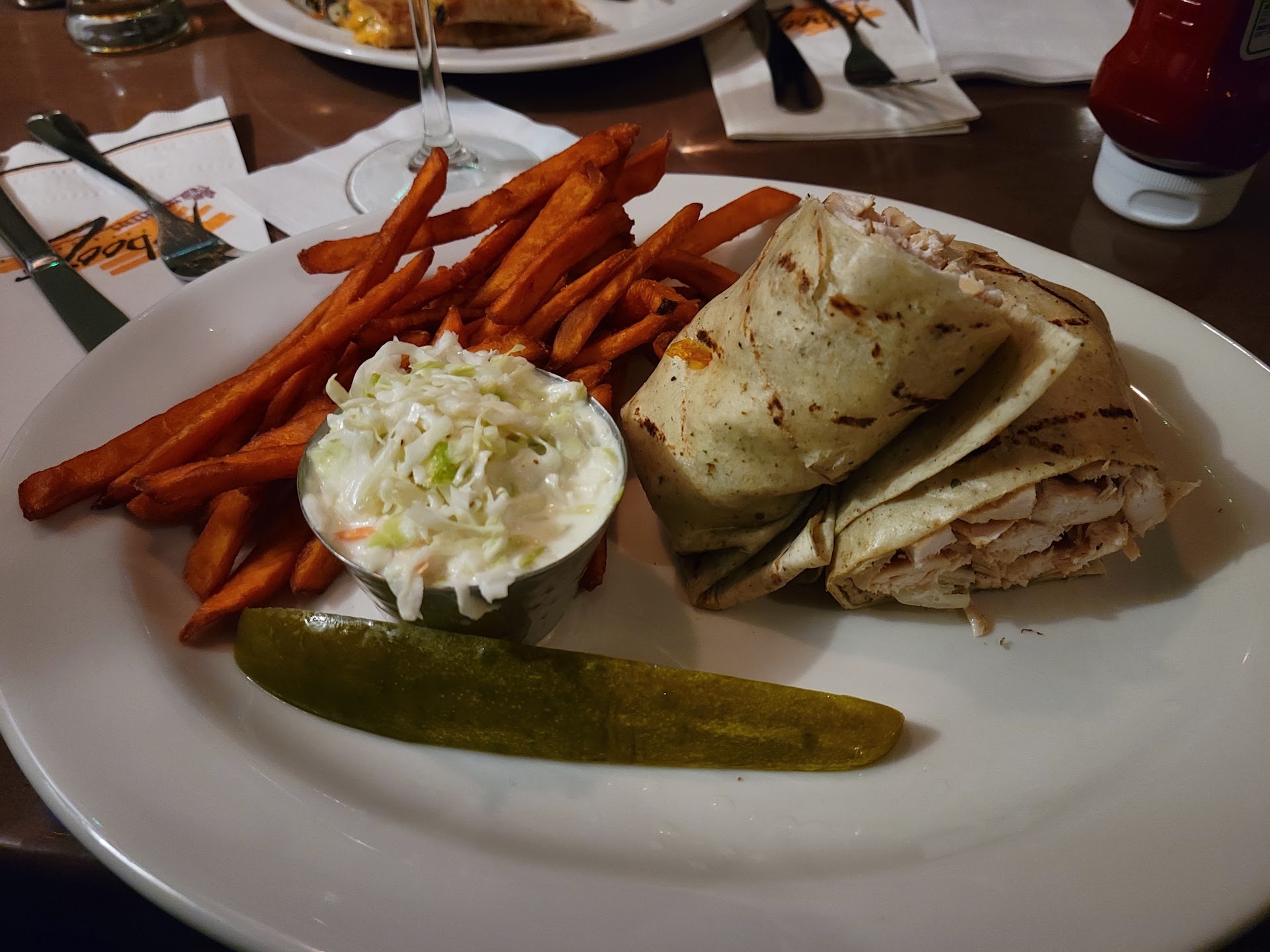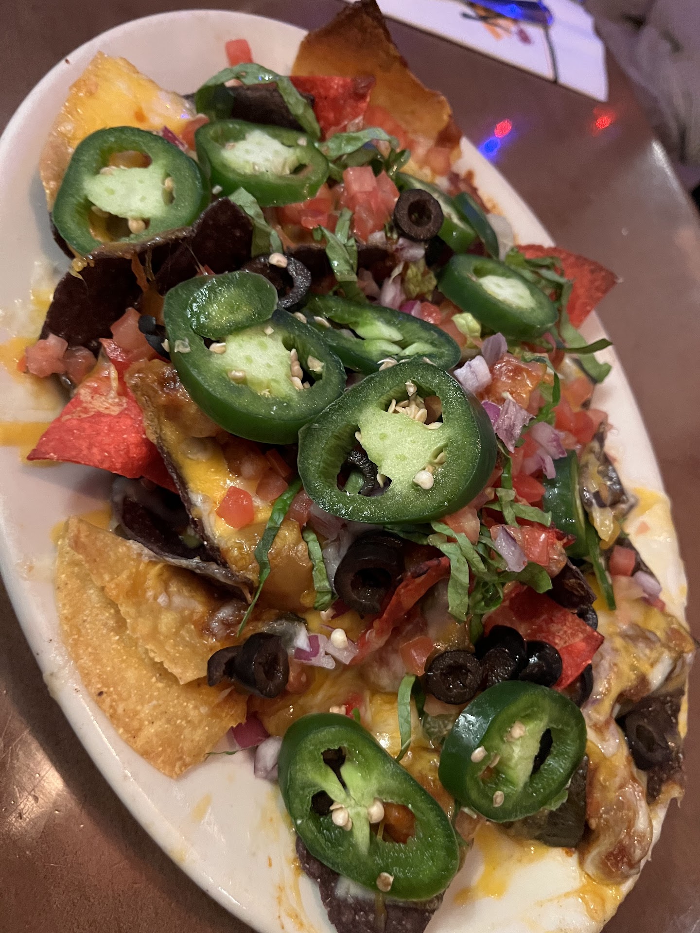 For appetizers, we ordered the vegetarian nachos and mozzarella sticks. Everything tasted fine and the food came out pretty quickly. For drinks, we ordered a gin fizz and a Manhattan. Both were sufficiently strong and not too sweet.