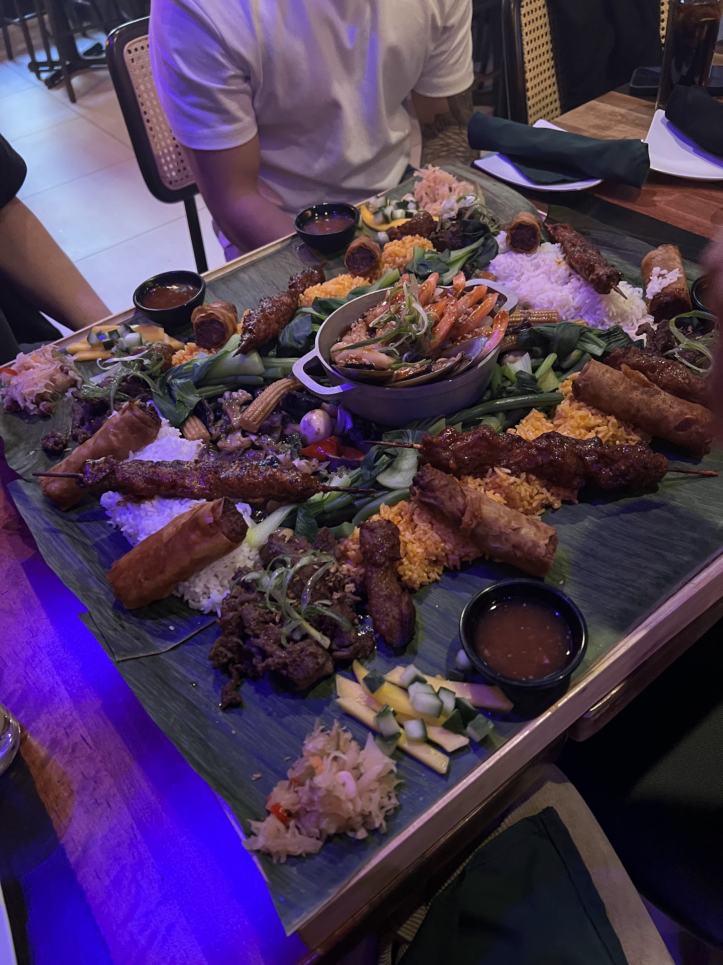 The bad: the mango salad was put over a bed of greens (which is fine, itâs their twist on the dish) but they didnât put any dressing or vinaigrette. The moisture from the mango was not enough to give moisture to the salad and it tasted dry. We had to ask for a vinaigrette to add to the salad. The calamnsi vinaigrette was amazing and it made the salad taste so much better. So if you order the mango salad ask for the calamnsi vinaigrette. The lumpia was a good size but a bit more on the salty side. The same thing with the palabok, it was alright but too salty. The worst dish, which really ruined the night, was the kare kare. Typical kare kare is supposed to have sauce that smooth in texture and usually made from oxtail. The kare kare here was made with pork and terribly salty. The sauce had curdled and did not have a smooth texture at all. The worst part was that the protein pieces were pure fat. I donât even remember if I ate any protein pieces, although I didnât eat much of it after I ate a piece that was pure fat. My father said they were trying to give people high blood pressure with the fat and salt in this dish. In some filipino cooking the pork pieces tend to have a layer fat connected to a layer of meat. This piece was pure fat no meat connected and it was so off putting. The pork pieces in the sinigang were also more fatty than meat. The inasal rice they gave us were old, you can tell because the some of it were hard when chewing.