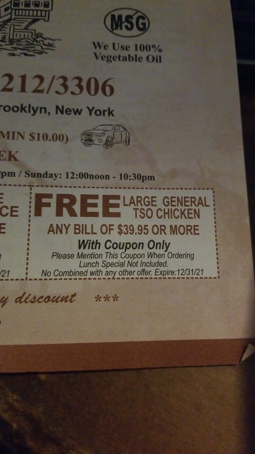 Read moreMost of the posted review about this place must be bogus. Two weeks ago I ordered two Generals chicken, NOT spicy, one with brown rice,the other with white rice, the combo meals come with egg rolls for delivery. I received pork fried rice with both, both orders were spicy and received no egg rolls. I called to complain and was given the run around even after they admitted their mistakes. Last week I order a beef and broccoli combo and the beef was over cooked and tasted like cardboard. Tonight I ordered a chicken and broccoli with brown rice combo. The rice was completely under cooked and tasted like it had just come out of the box. The chicken was dry and over cooked and the sauce was too salty. I ordered a small egg drop soup and I was all broth and about a table spoon of egg white. My family and I will never order from this over priced with horrible food...