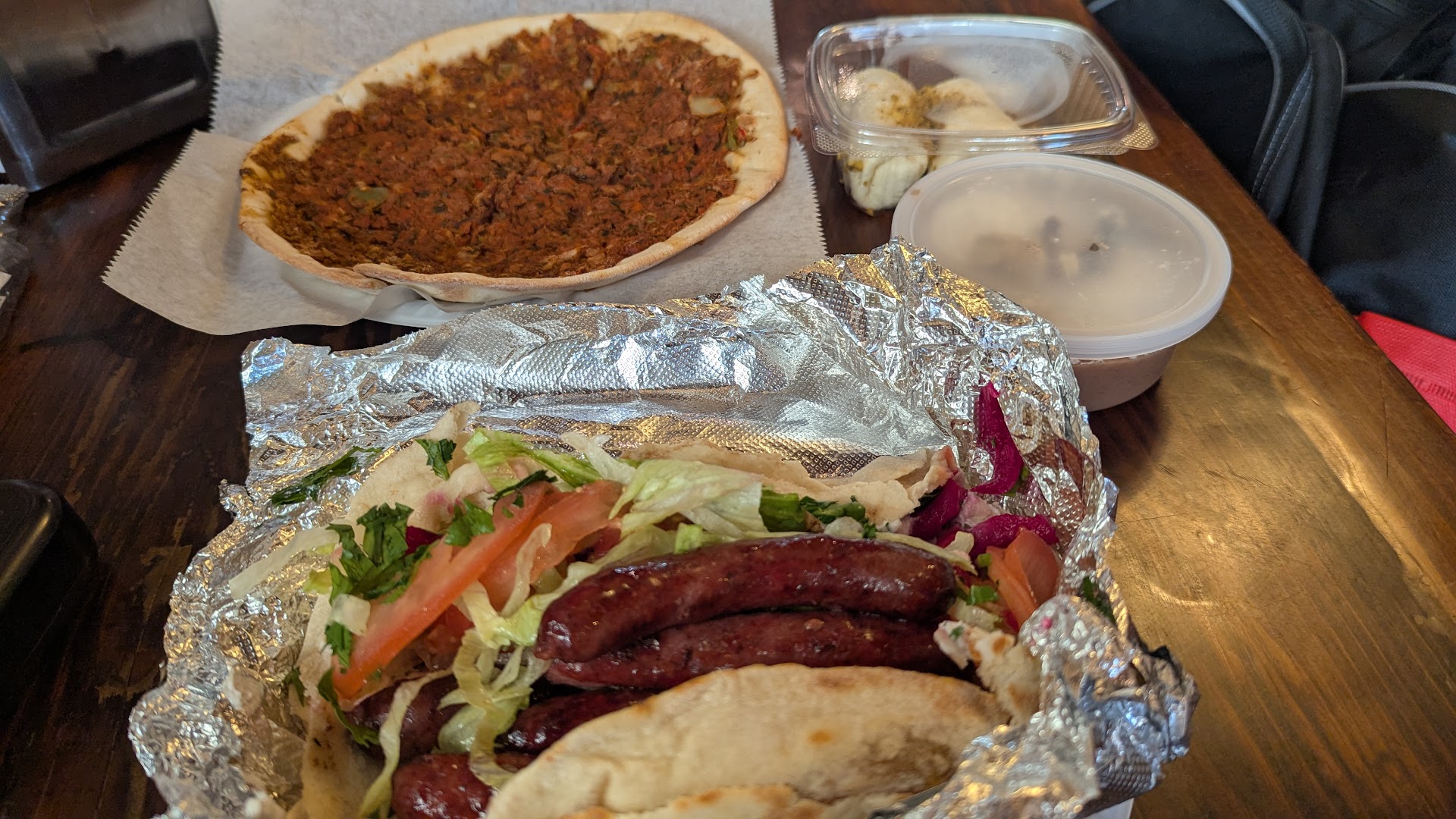 Read moreMakanek sandwich's sausages are delicious and really well seasoned. Has typical Mediterranean veggies but the sour cream and pickled radish (?) adds a really nice balance in terms in sour and acidity (which differentiates it from just another typical gyro).