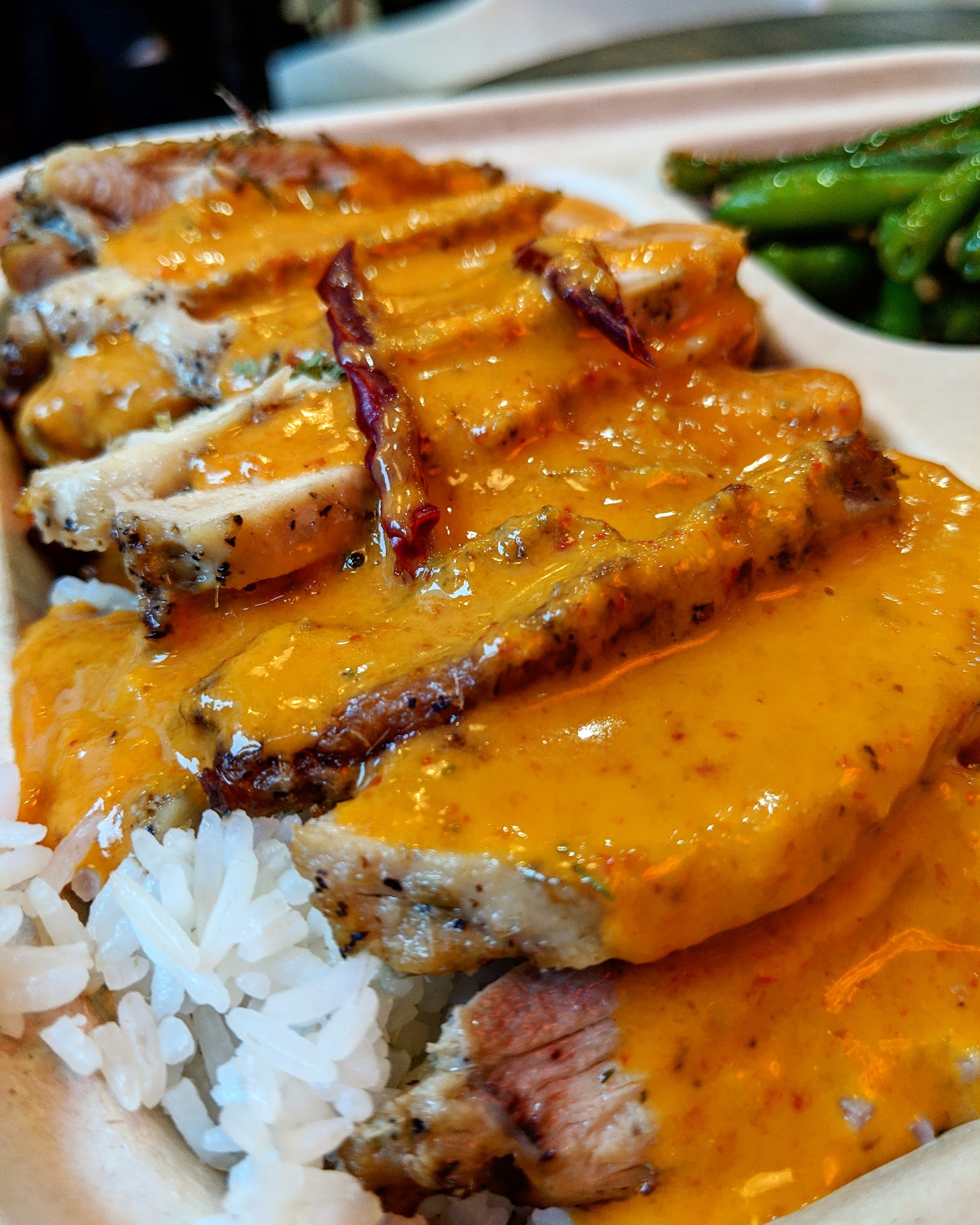 Read moreThis is my first time trying Kati. I ordered the lemongrass chicken with Kati curry with white rice and sides of sweet potatoes and zucchini. Everything was so DELICIOUS! The jasmine rice had the perfect amount of water so it was plump and fluffy. The texture was amazing. The sweet potatoes with a hint of coconut juice and zucchini (both cooked perfectly) was a perfect "blander" sides to bring out the "main" course: THE CURRY! The Kati curry was spicy but so addicting and yummy. Rich, smooth, creamy, spicy, herby and plenty of GOOD quality coconut milk. I was pleasantly surprised by the spice level and amount of coconut milk in the curry since restaurants usually tone it down in the city. This is great news! The Thai tea tasted just like Thailand: thick, sweet, and creamy. The tea was distinct as well. LEGIT! The service was superb. Staff was super friendly with smiles on their face. They warned me about how spicy the Kati curry was since it was my first time having it. Overall very impressed with the freshness of the ingredients, spice level, and service. Reminds me of Thailand! Will be back...