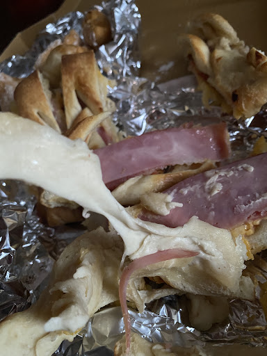 I ordered meat Stromboli and I requested only sausage, bacon, and pepperoni but instead they gave me ham and American cheese but wasnât the worst part the bread was super uncooked⊠I thought at first it was mozzarella cheese but when I ripped it a apart it wasnât.