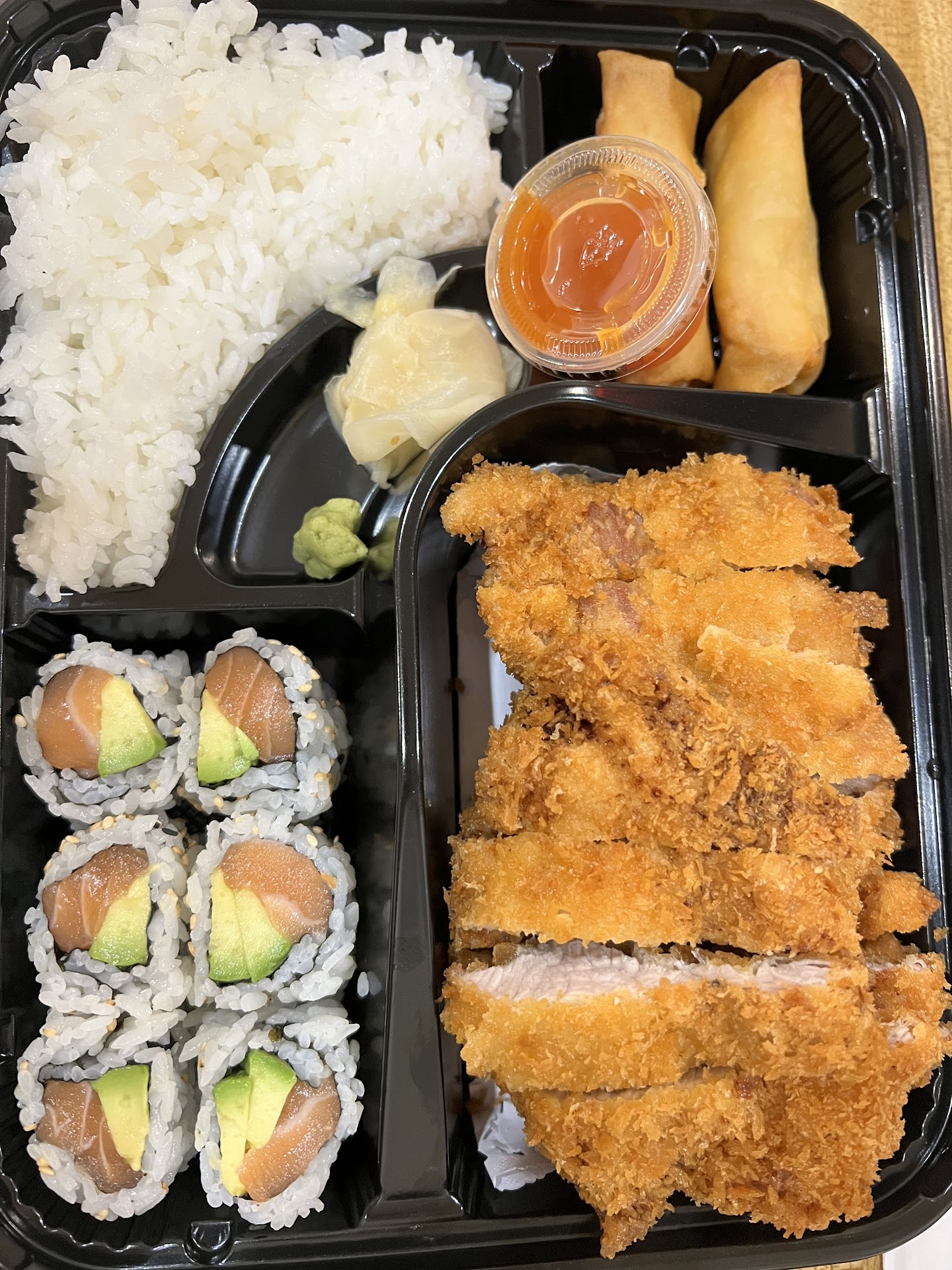 Vibe - very small. 3 rows of table for dine in. Busy behind the sushi counter and one hostess. We were the only dine-in party. Small business that is worth supporting.
