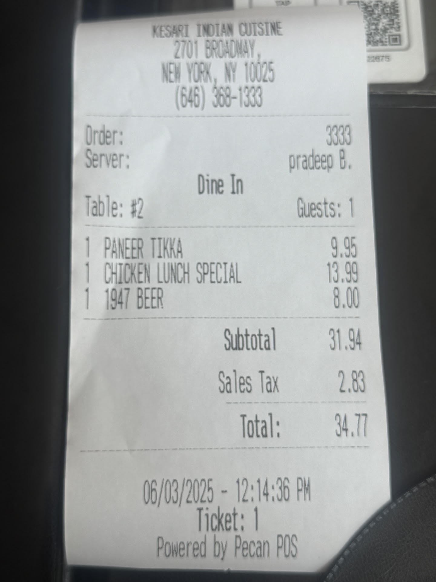 The food was amazing. It was delicious and the service and food quality went hand in hand for a great experience. The lunch specials are an amazing option which is what I tried. I also had one beer and tried paneer tikka for the first time. The naan was amazing too! I was completely full after having 3 pieces of paneer and the lunch. They provide as much rice as you like. I came home with leftovers. It was perfectly portioned.