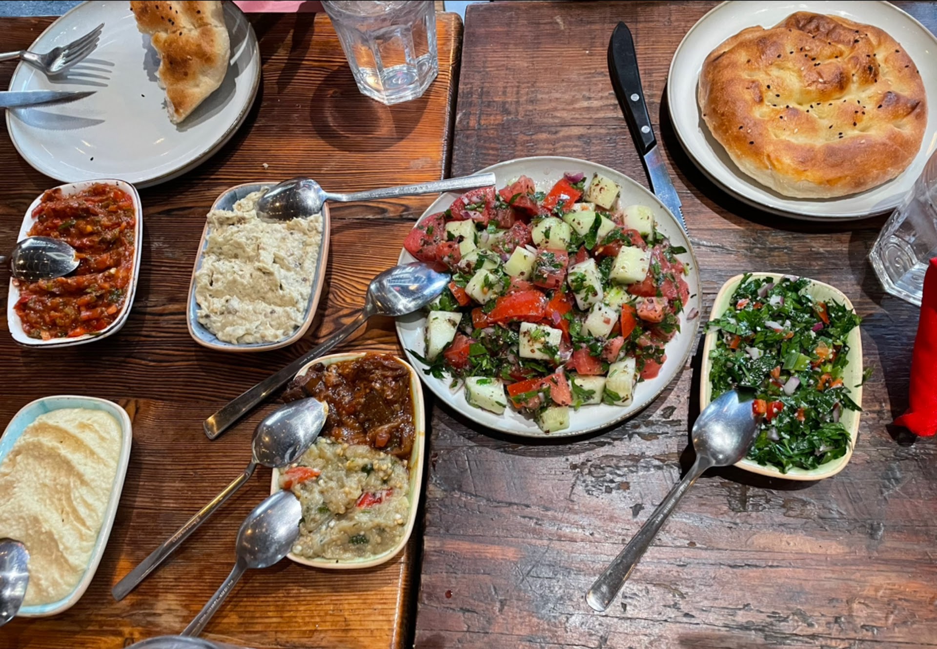 We ordered the small (5 kinds) mix vegetarian cold appetizers. The spicy vegetables dip was especially good. Their babaganoush has perfect creamy and not so smoky flavor. Sometimes I find babaganoush at other places is too smoky but what they have here was subtle and delicious! After trying 5 different cold appetizers, I believe that their other ones will be worth trying. They all came with piping hot handmade bread. So good!