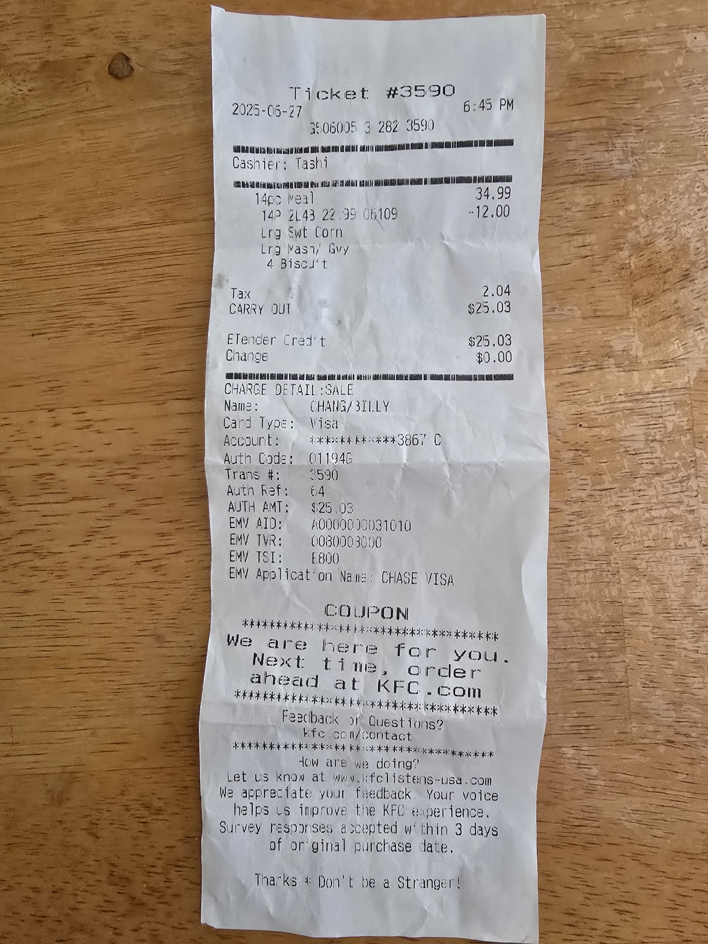 This KFC is about 3 minutes walking distance from my family.. About a year ago, we swore off this KFC after a bout of food poisoning courtesy of their coleslaw. Fast forward to yesterday, lured by a coupon and a bit of misplaced optimism, we decided to give them another shot. Big mistake.