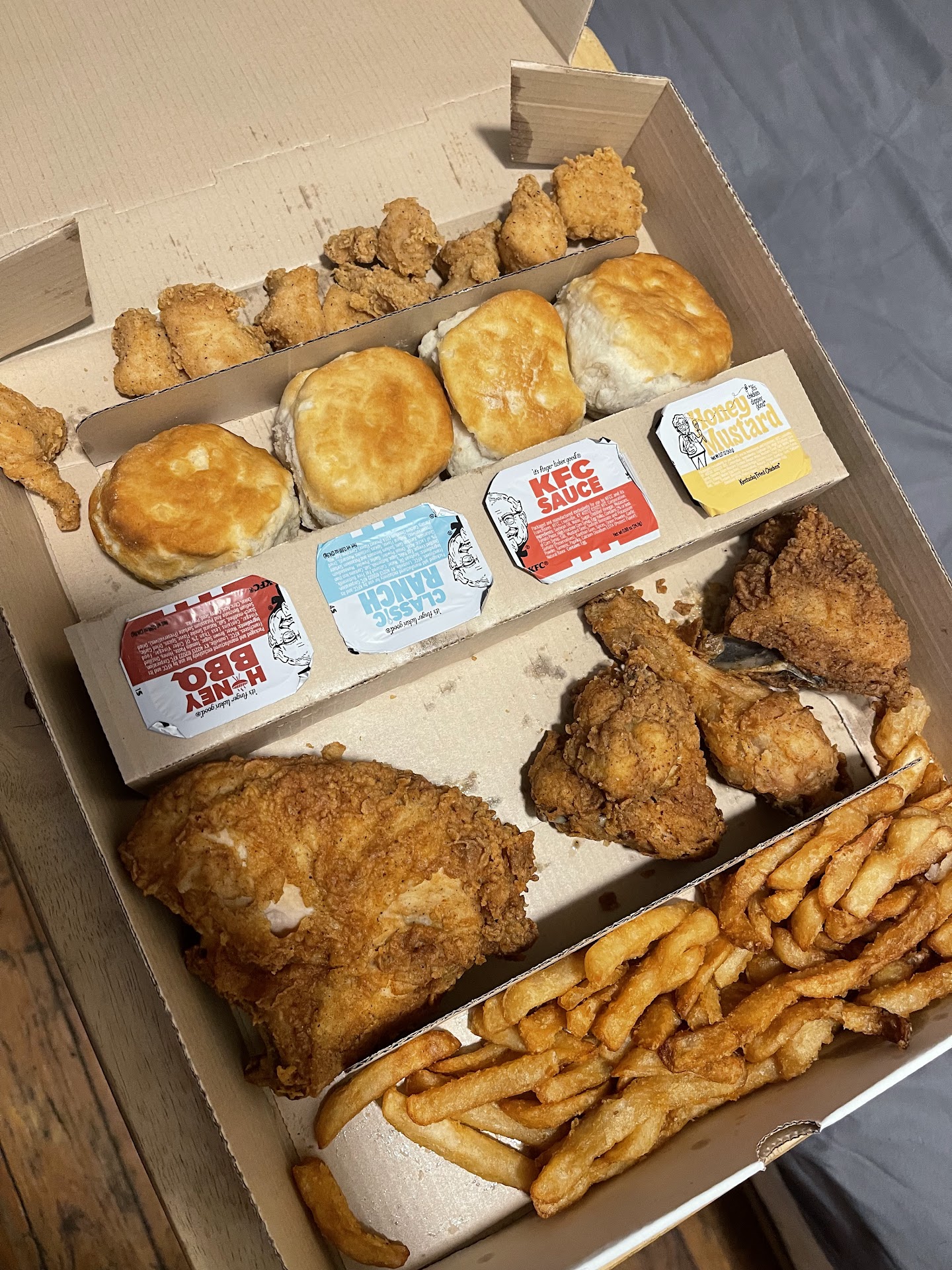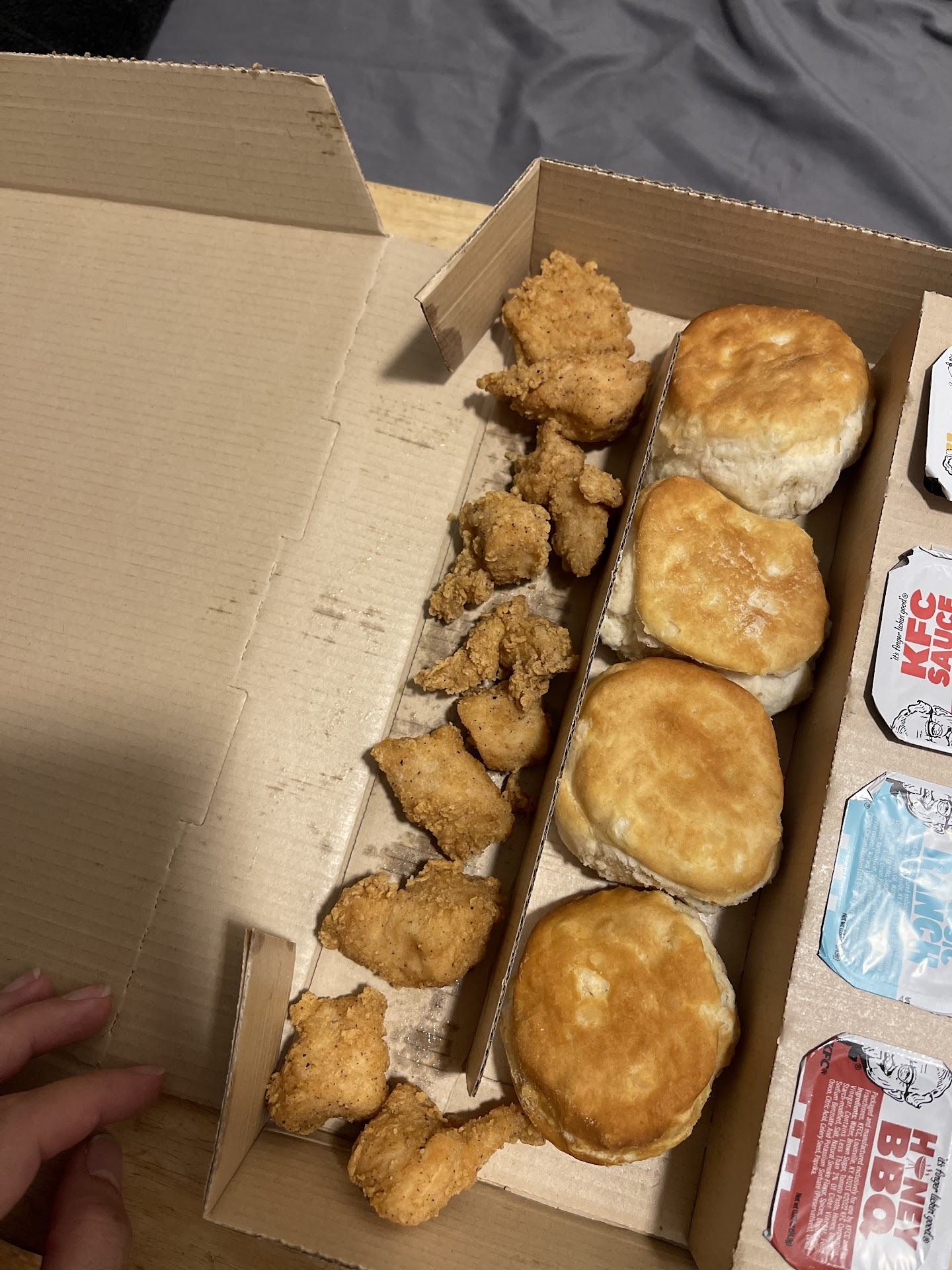 Second: Went on September 9th, 2021 and it was around 7pm. We tried to use the drive through and the intercom wasn’t working so the lady had to wave us to the window. We ordered the family piece with mash potatoes and Mac and cheese. The lady at the window had a major attitude, she cut me off in the middle of my order and told me I can’t choose my sides and it only comes with mash and coleslaw. She wouldn’t allow me to have Mac and cheese. I said fine and ordered anyway. The chicken was sticky and gross and wash fresh and the biscuits were again hard. It was actually the worse KFC iv tasted.