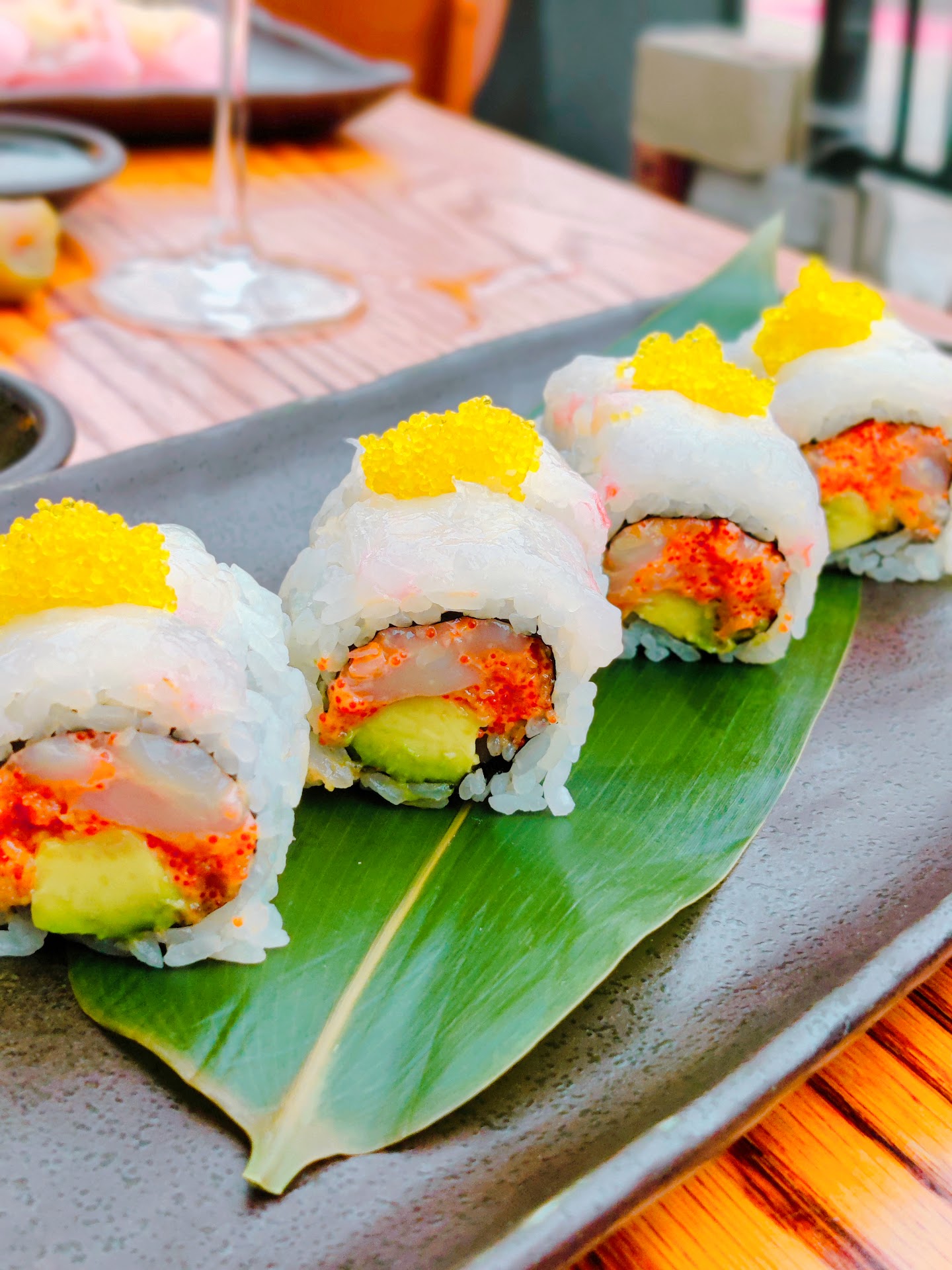 As the food came out, it was a beautiful sight to see. The plating for the rolls was amazing! Being place on a Japanese traditional rectangular plate with the rolls on top of a bamboo leaf. I didn't want to touch my meal as it was just to eye pleasing. As I took my chopsticks and tasted one of my rolls I knew it was not long before my plate would be empty. The flavors of all the ingredients meshed together yet tasting each one. The yuzu tobiko (flying fish roe) definitely added an extra flair to the taste.