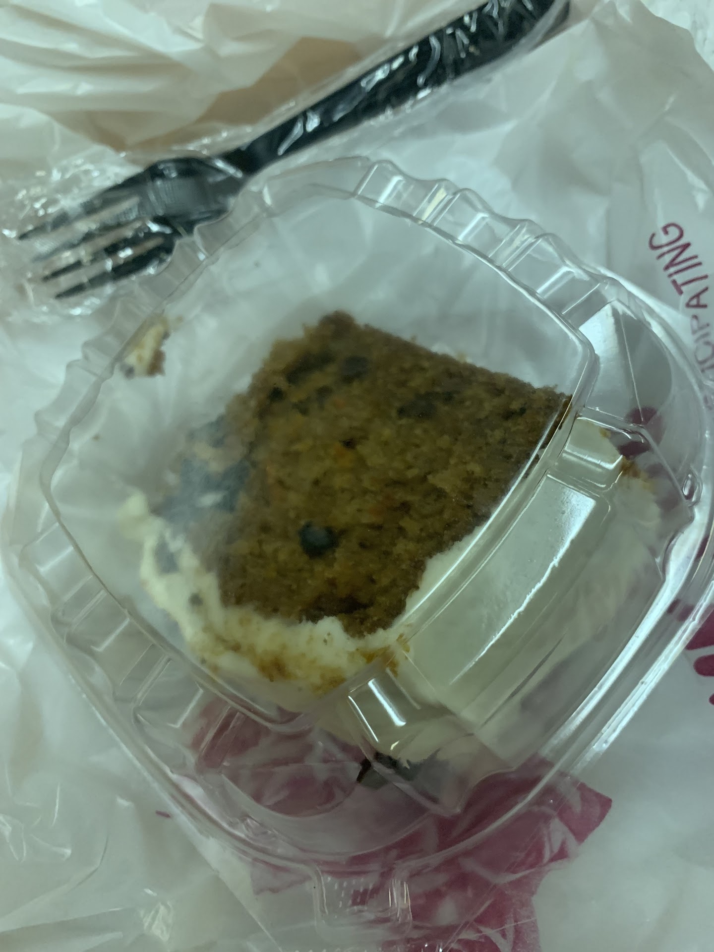 Then she rung me up. Threw my twenty percent tip in the register without saying a word. Then jammed the slice of cake in a bag with a fork and no napkins. Which she then threw in the service window mind you the cake was on its side when she carried it over and it landed upside down.