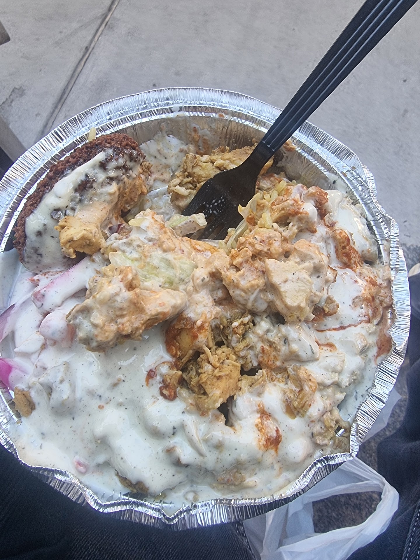 Food was great. Workers were super nice. Chicken tasted really good, similar to Halal Guys flavor profile but 10 times better. Fresh falafel was fantastic, amazing inside texture, nice exterior crunch. I loved how fresh the salad was on the side, juicy tomatoes, nice onions. Hot sauce is super spicy, so be careful. If you order the falafel to go, I would suggest getting the white sauce on the side because the falafel doesn't stay crunchy for too long if it's sauced up, and that crunch makes it 100 times better. I would also recommend getting extra white sauce in general because the the platters are somewhat dry by themselves.
