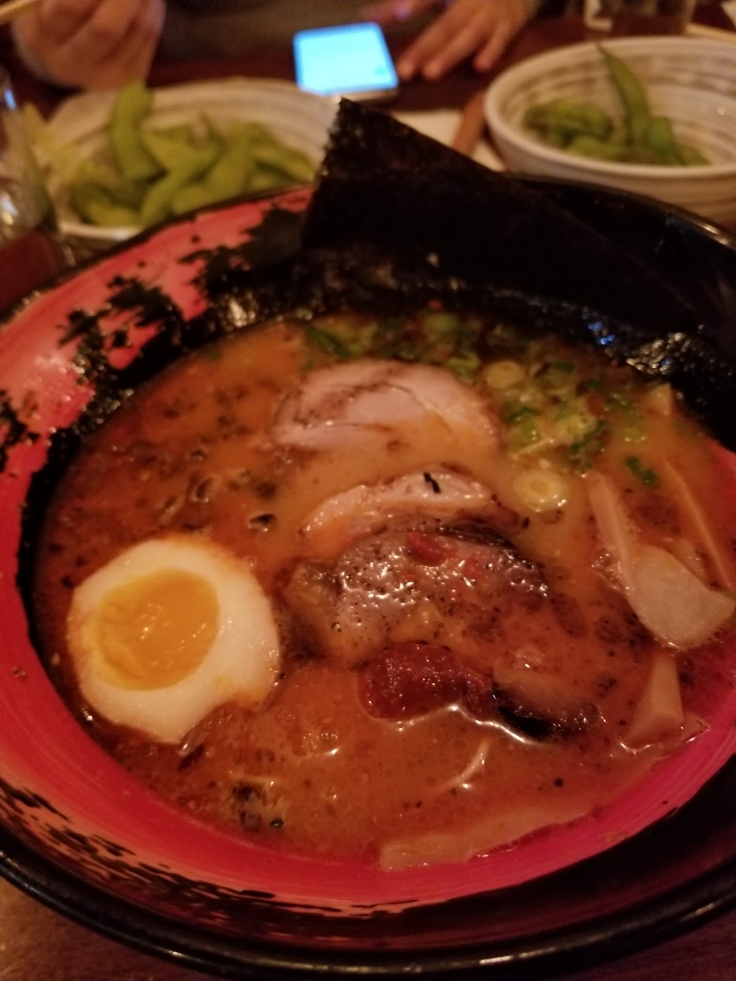 Next, we got 2 orders of shoyu ramen ($14), a chicken broth based ramen with chicken breast, corn and mushrooms, a parco ramen ($14), which is the pork bone broth and curry based ramen with a pork cutlet and I got the red tonkotsu ($13) ramen, which is the spicy pork ramen. The ramens came out hot and fast. We were pretty stuffed from all the appetizers so we barely had time to digest before the entrees were presented.
