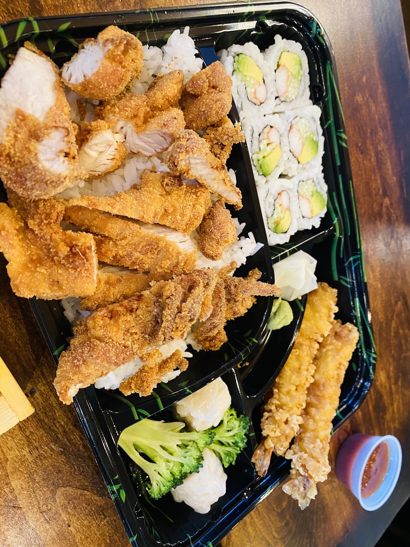 Now on to the food. The sushi a la carte was fresh but very thinly sliced, which doesn't give you enough of a bite to truly savor its freshness. So I hope in the future they would consider increasing the portion size of the fish to really give the sushi/sashimi pieces more of a bite! The bento box, however, was a bit disappointing unfortunately. First of all, the chicken katsu looks like it was just thrown in without any consideration of presentation. Second, the chicken katsu isn't your typical panko-breaded katsu, it definitely has a more of a Taiwanese chicken vibe to it, where it was overly fried to enhance its crispiness, but at the cost of making the meat quite tough. The Siu mai was watery and didn't really add much to the bento. However, one of its saving grace is the shrimp tempura, which was fried differently and was both very crispy and flavorful! So highly recommend the shrimp tempura, but not the chicken katsu.