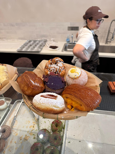 Read moreI had been meaning to try Kora for so long but kept missing the pop-ups. When I finally did go on a Sunday at 9am I anticipated the wait but the staff was INCREDIBLY helpful in coming out, explaining the wait, the process and giving us hope, answering questions on what they would likely have and what might sell out. I got inside about 10:15 and loved the space. The decor is very neutral toned and I recommend sitting if you can. Since there is currently a 6 pastry cap, I got the ube babka, coffee cruller, cinnamon cruller, spam pan suisse and leche flan donut. Every single one knocked my socks off. I have been to allot of bakeries, and several Michelin Star restaurants, but I can't think of any that compare to Kora's pastries in terms of variety of flavor, texture & dynamics of taste. The lofty, butter-rich steam air that is trapped inside each layer, the soft and supple textures of the bites was intoxicating. The spam pan suisse with pimento cheese had a touch of savory heat while the outer glaze added crispy, crunchy sweetness. The the braided babka touched with salt played well together with the sweet profile of the ube center. I am very partial to coffee/coffee cakes and the Coffee Cruller was my favorite. The outer layer and coffee is delicious but I could not believe how tender, cloud loft, buttery soft the inside was. Even if the pastries are sold out the cookies and coffee are sold throughout the day and the full glass storefront lets in plenty of light. It is going to be my go-to coffee shop. Also, I really appreciate the signs in front explaining the current situation with the facilities, projected waits on weekdays vs weekends, and the explanations of the multi-day processes it takes to prep elements that go into the pastries. PLEASE don't be upset if items are sold out as all new businesses have growing pains. Do your homework and plan for a 1.5-2 hour min window from the time you arrive to when you eat. You can taste the effort and artistry in each bite, so make time for the experience...