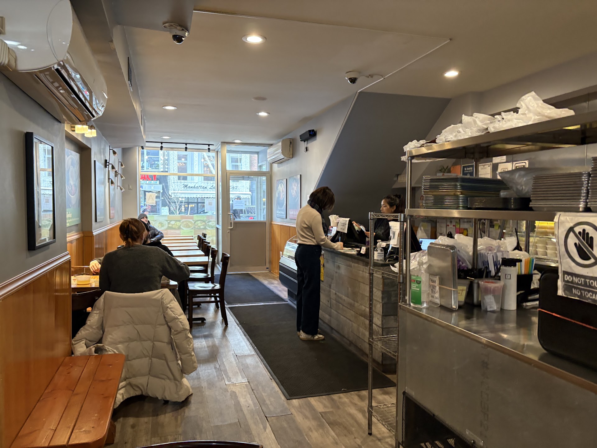 There is a small dining area. We asked for plates since we were sharing two dishes, but the cashier told us they were not allowed to give out plates. They gave us 2 takeout bowls instead, the kind you would use for a small soup. Meanwhile, the staff was sitting at a table in the back using plates, but customers are not allowed?!?