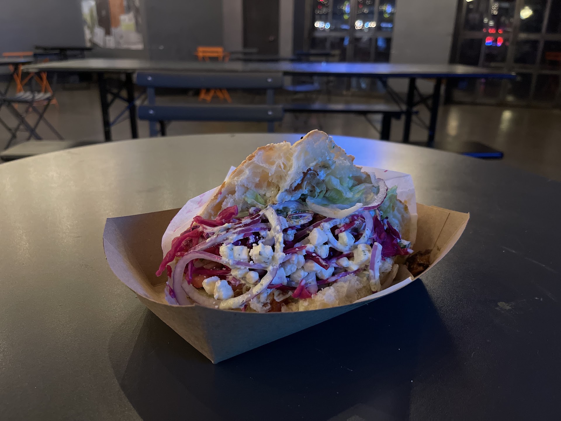 The cold topping are consistently crispy and fresh. The picked onion and cabbage is just right, not too tart with just the right amount of acidity cutting through the richness of the chicken thighs, garlic sauce, and cheese.