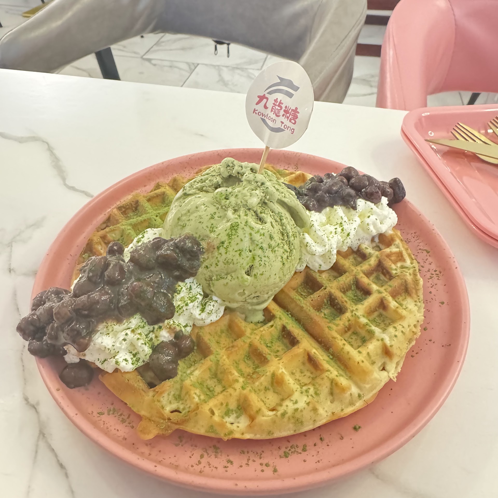 Kowloon Tong has very easily and quickly become one of my favorite dessert spots in Bensonhurst Brooklyn! The interior of this quaint, unassuming dessert place is so amazingly cute and inviting. With the lively pink and white interior, it feels like I can have any conversation with anyone at this dessert spot. They have this amazing deal where they have BOGO 50% off for bubble tea. I got the regular Kowloon Milk Tea and it was really good and also sweet, so definitely need to adjust the sugar levels depending on your preferences. The Jasmine Green Milk Tea was also good and even better at a lower sugar percentage. Unfortunately, the tofu pudding was sold out on a Sunday night, so we opted to get the matcha ice cream waffle. The matcha ice cream and whipped cream were really delicious. The waffle part was okay, I personally like my waffles a lot softer. I have also tried the souffle pancakes here which were really yummy. I would definitely keep consistently coming back for the desserts and cute cafe vibes! The service...