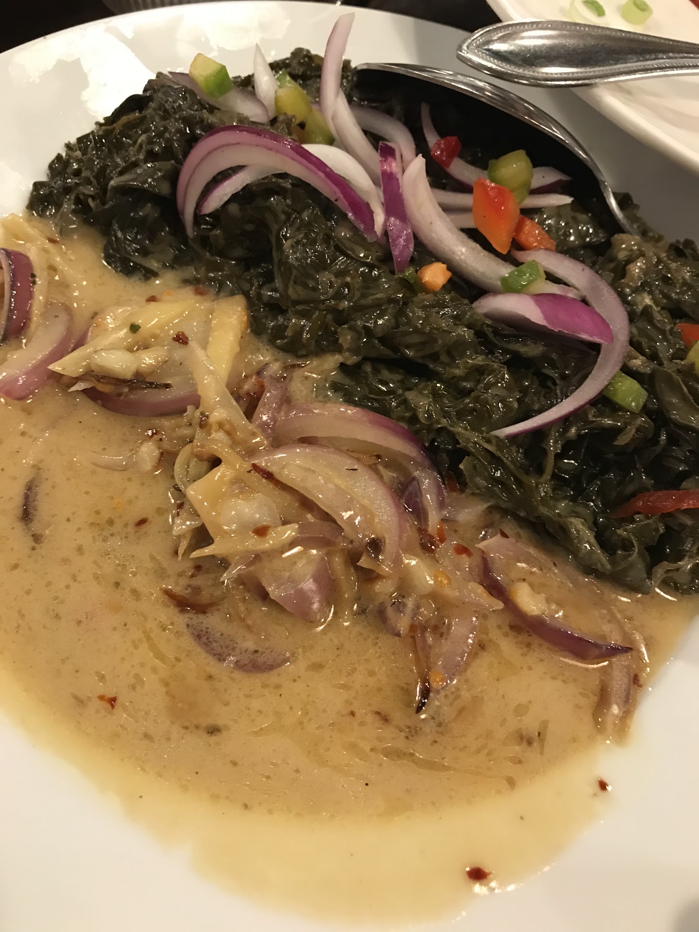 I found the sago drink to be a little bit too sweet. I felt it could have used more ice to help dilute the flavor. The lumpia shanghai was very good and not too greasy. It came with the usual sweet and sour dipping sauce from a bottle. The bistek was my least favorite dish of the whole meal. The meat, while tasty, was incredibly tough. And the portion was so small, barely enough for one person. Strangely, it came with a huge side of white rice. Still, I would not recommend this dish. The crispy pata was also on the small side but quite good. It had a nice crunchy skin and the meat was not too fatty. It did not come with the usual pickled veggies but only with a small dipping of soy sauce. Too bad because it really needed that acidity from the pickled veggies to cut through all the heavy meat flavor. The spicy Laing was a real pretty dish to look at. It sort of had the âdeconstructedâ look with the taro leaves on one side and the sauce on the other. This is not the normal way it is served but I thought it was quite interesting. The dish had a nice punch but was not too spicy. I could tell from the taste that they used canned taro leaves which gives a strange after taste in your mouth. My companions like this dish, me not so much. The garlic fried rice was quite yummy, but I really wanted it to be more garlickyâjust a personal preference. The best part of the meal for me was the dessert, the crispy halo-halo. This came in a tall glass and had very good flavor. You could really taste the taro in it, and I loved the crunchy rice topping. It was a bargain at $7. I would come back just to order just this.