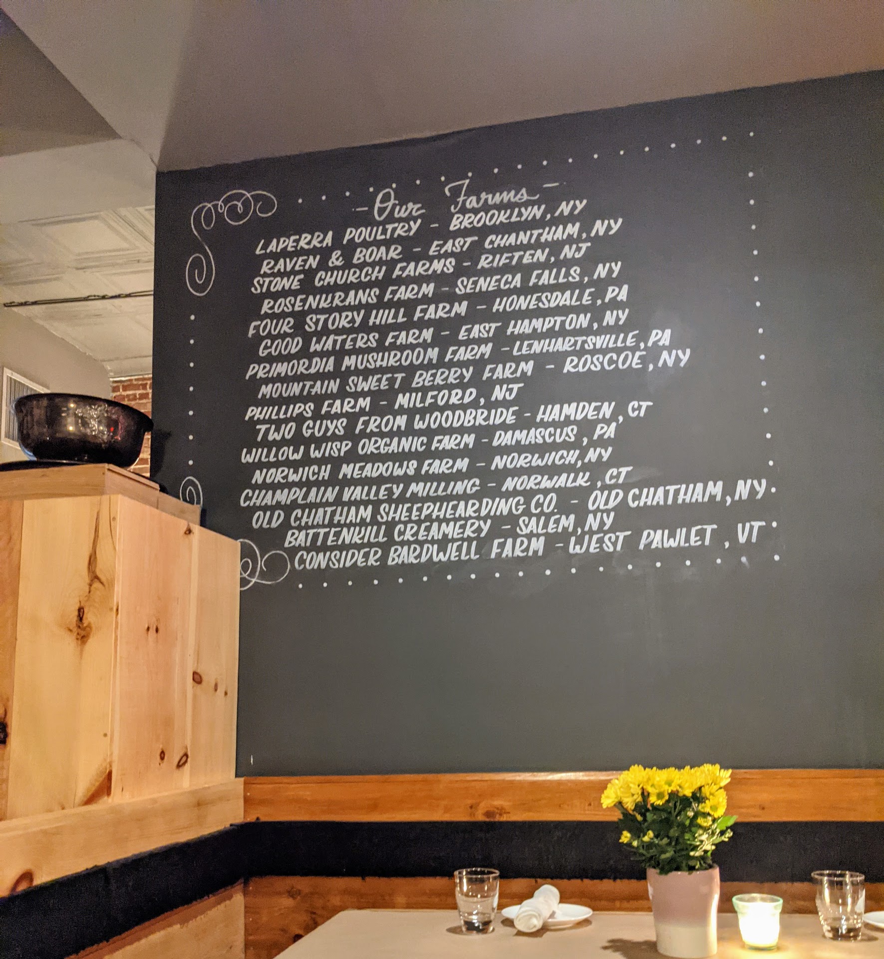 The food- They do work with local farms and have a list on the wall. They also sell wine by the bottle and its relatively inexpensive, we got a sauv blanc which was about $20. What they do with the food is poetry though, the cheese souffle came with a cheese ice cream, the broth of the mussels was good enough to be from France and the pate comes with a small balloon of cotton candy on the side. I wasnt the biggest fan of the steak tartare, but it was soft and really well prepared, the clafutis tasted excellent, but was slightly on the stodgier side.