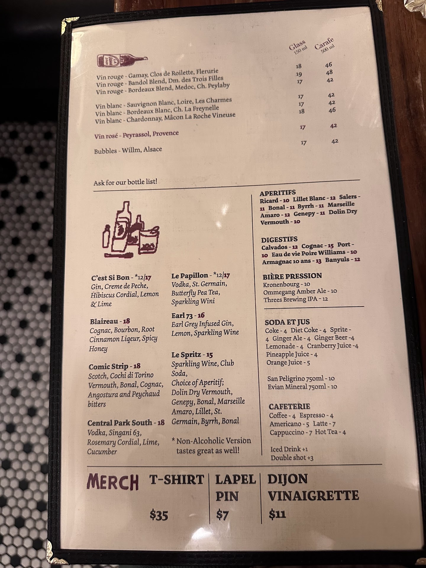 Next was the overall vibe. We sat upstairs which I like, but there was a projector screen hanging against the wall and it wasn't playing anything. So it just looked weird and created an amateur aesthetic. Either play old French movies on a loop or pull the projector screen up. Having it down and blank looks terrible. Next was the music. Totally wrong vibe playing classic rock and 2000s alternative rock. I am in a French Bistro. I do not need to hear "Shot Through the Heart" by Bon Jovi or "Mr. Brightside" by the Killers. Play indie-pop french music or new wave or even smooth jazz. This will create a better more authentic atmosphere. Listening to Bon Jovi while eating entirely sub par mussels and a basic piece of bread that cost me $4 made for a really confusing and frustrating experience.