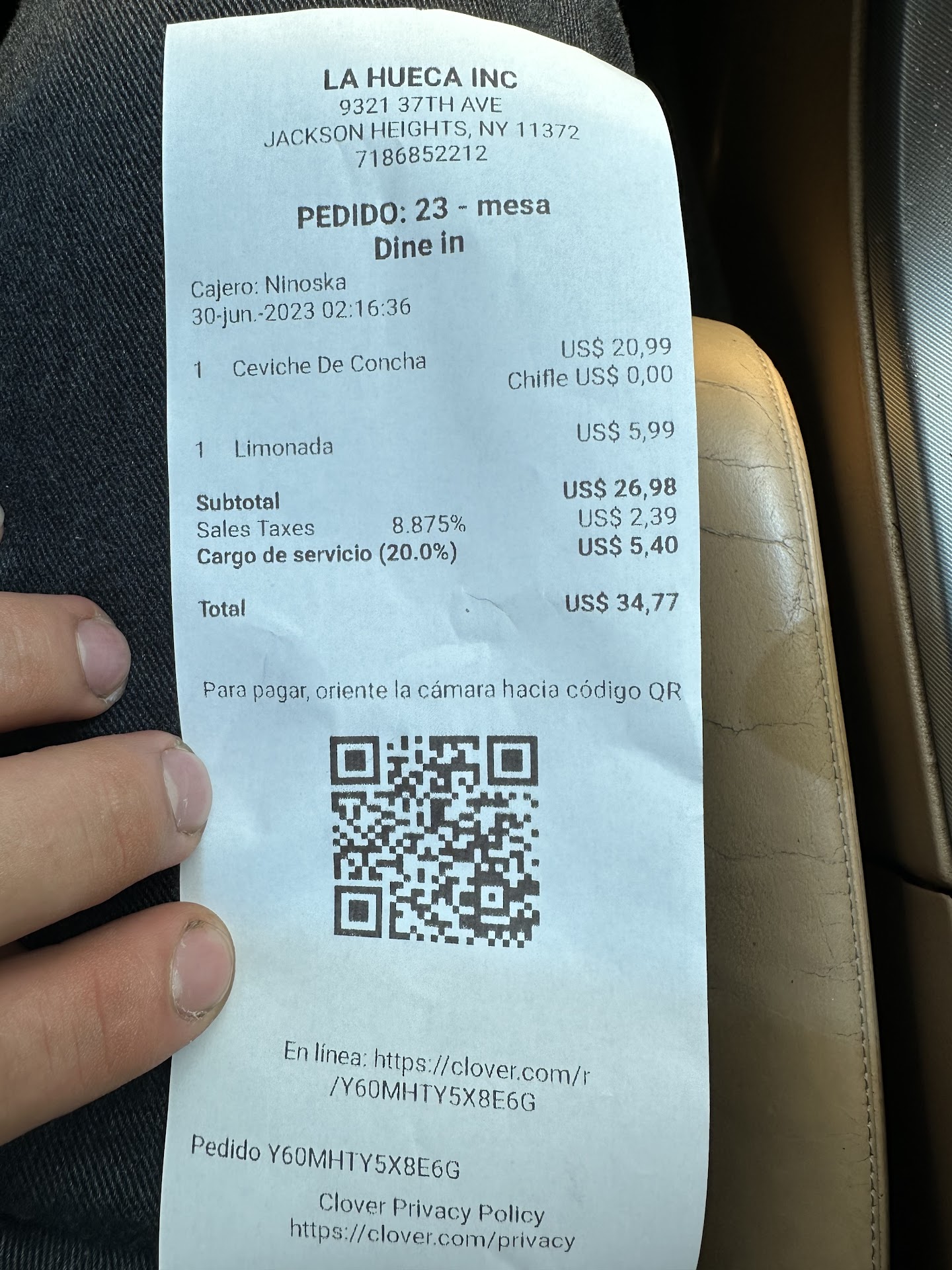Read moreBe aware, they charge a 20% service fee. Other than that, service was ok. The food great and some lacked Ecuadorian flavors. The bandera it's a plate that has guata, seco de chivo, encebollado and shrimp something, not shrimp ceviche. The guata, chivo and encebollado delicious. The encebollado had a faint fishy flavor. Like the fish was old when they cooked it. But it was still good. The shrimp was bad. It had no flavor. It was like shrimp in a cup of water. The corviche was above ok, the empanadas de plåtano ok. It was plenty of food. I did enjoy the meal overall. I didn't tip because they already had it added to the bill. Bring cash if you believe they don't deserve 20%. Although they shouldn't include this without posting or letting me know before hand. But it isn't the first restaurant I have had this experience with tip added automatically. Some even charge you q CC transaction fee . Definitely recommend the guata, chivo and...