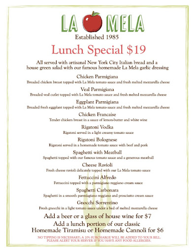 What a strange recent review I just read that prompted me to write to write this! Small portions!?!? Poor quality!?! High prices?!? I truly believe that everyone is entitled to their own opinions and this is why we have forums like this to express those opinions! But let’s just confirm some facts….. thousands of reviews across many platforms and I would like to know how many reviews state POOR QUALITY? Even if you have never been to Lamela- fact is that restaurants in NYC don’t last very long if the quality of their food is “poor”. Poor quality leads to zero patronage leads to not being able to pay rent leads to a restaurant closing. That is just a fact! Sure- to each his own but quality wise? 20 years+ of eating here and knowing personally dozens and dozens of big families who have been eating here for years as well….. the quality of the food has never been anything but spot on! From the fresh bread to the salads and apps and pastas and meats…..quality is not something lacking at La Mela! Start out with the freshly baked crusty Italian bread and slather with butter or better yet… some olive oil and balsamic vinegar mixed with grated cheese and black pepper…. Mix that in your dish and dip away! That is what I love to do!….. have a house salad with the greenest of greens and the sweetest of tomatoes in the house garlicky dressing !! YES! Next up order a caprese salad - fresh soft handmade mozzarella basil and those sweet tomatoes again always hits the spot! Can’t forget some baked clams and fried calamari…. Be sure to dip your bread in the clam sauce from the baked clams and the marinara and basil sauce served with the fried calamari! Those are my go to’s always and portions are the opposite of small!!! Go and see for yourself ….. even in the many pics you can find online those are accurate portion sizes and you will never leave here feeling hungry….. I can go on and on about so many other dishes I love ( and always have to take food home because there is too much!!) fettuccine Alfredo made with fresh pasta- creamy cheesy and better than I have ever had. Period. Chicken dishes? What to choose!?! Go for the parmigiana or the francese! Old-school Italian recipes and the flavor profiles shine through every time! There are so many more dishes that I can speak on but I think you should go and try them for yourself. Don’t forget to end the meal with an Italian array of desserts all in one platter… Why should we have to choose just one, right?🥰 the drinks flow- wine is abundant and the pricing?? I am posting their family style menu/ please know these prices are insane for a NYC restaurant! You have a choices of $40,$50 or $60 per person menus - these are family style!! TONS OF FOOD!! What about their lunch specials—— find any other restaurant in NYC that have such an affordable delicious deal!? I challenge you!….. quality, pricing, portions- never have been an issue at La Mela. There is only ONE BIG ISSUE I have with La Mela—- and that is their expectations that I can eat ALL THAT when the plates start coming to the table! 🥳 but again— they never frown about doggie bags and I always leave with a few ( that never goes to my doggie btw lol)……there’s an Italian saying that is “ Il cibo è il linguaggio dell'amore." Food is the language of love….. head to Le Mela and trust me…. YOU WILL...
