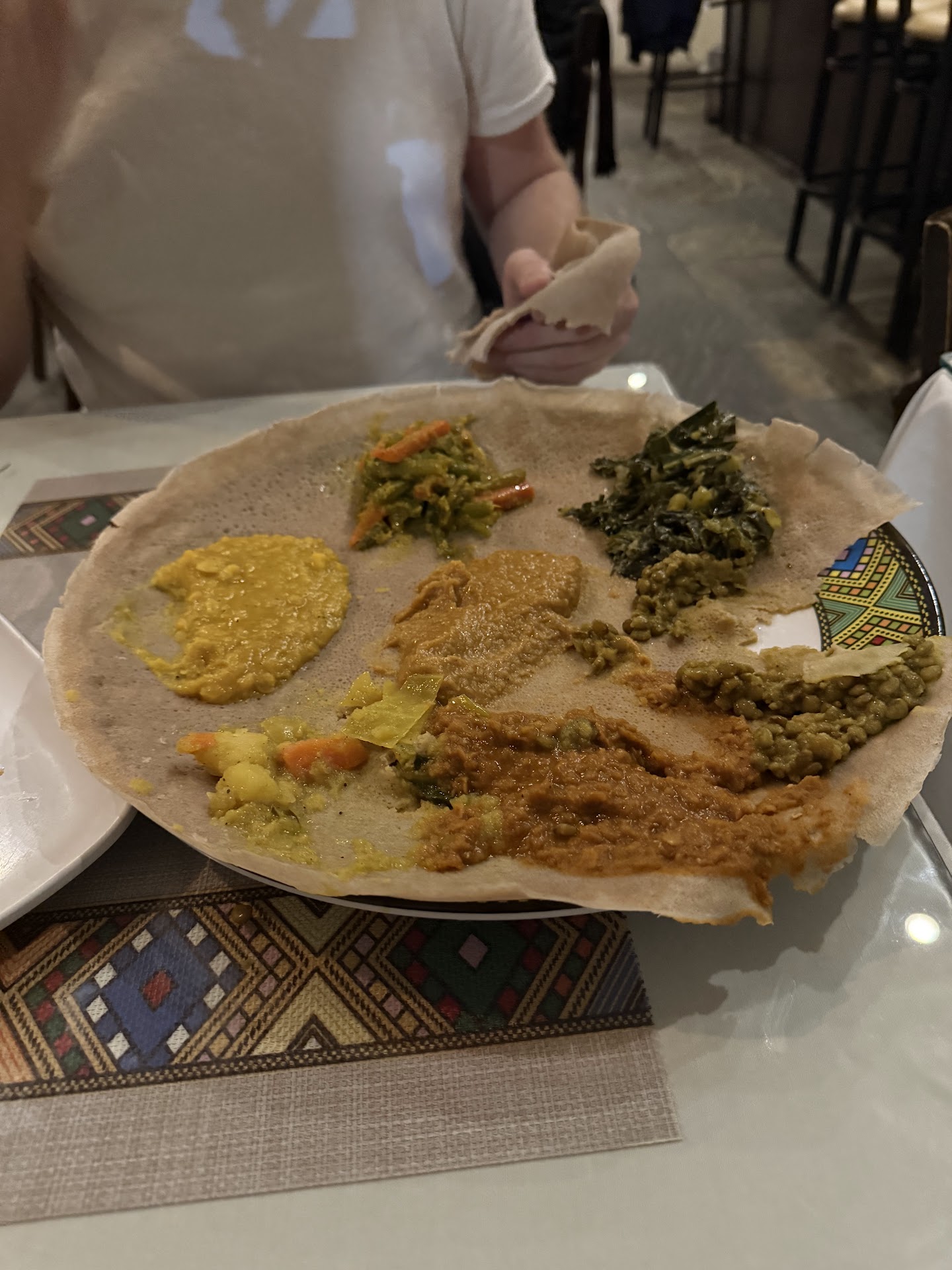 First of all the food is not spiced at all. The misir tastes like tomato paste and lentils, the spice ratio is all types of wrong for the Tibs (literally the easiest Ethiopian dish to make!!) and a white person could have made better butter than the one used here for the kitfo.