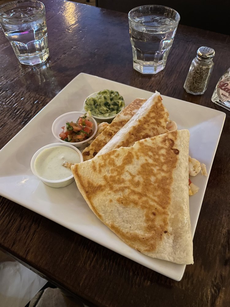 They advertise margaritas for happy hour outside and Taco Tuesdays any taco 3 dollars each. We were the only people inside of the place. The waiter told us that the margaritas that were part of a happy hour were only the regular margaritas you weren't able to get any flavor margaritas. I had my heart set on a strawberry margarita so I had to pay full price for it which was I believe $12 each. I really didn't know what I wanted and when I was looking at the menu I wasn't too impressed because it seemed to be more of like a diner with some Mexican food. I was so indecisive. I also didn't like that they didn't even provide chips and salsa for the table like most mexican restaurants do.I finally just ordered a shrimp quesadilla. My friend ordered fish tacos. And my other friend ordered a chicken quesadilla.
