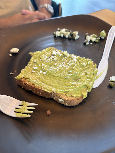 My husband's $12 avocado toast was disappointingājust a slice of untoasted whole wheat bread with feta and capers, neither of which were listed on the menu behind the counter and neither of which he eats. Rather than complain, he scraped it off, but we both felt it wasnāt worth the price. On top of that, the utensils were flimsy disposable plastic despite being served on glass plates.
