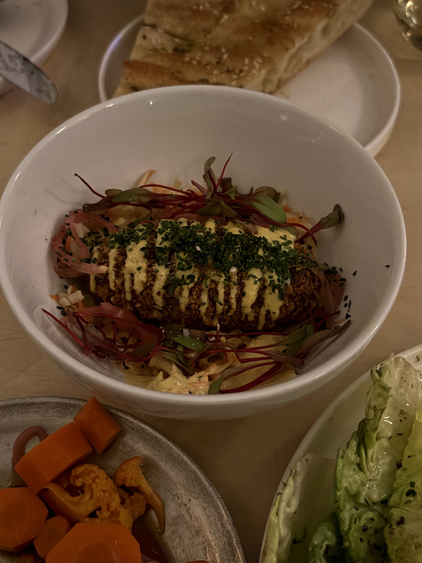 Pros: the dips, bread, pickles, and cocktails we all had absolutely slapped. The dips were decently generous and super flavorful. Everyone loved their cocktails, I had the Taly and I’m obsessed. The interior is lovely, vibe well curated. Servers were warm, friendly, knowledgeable.