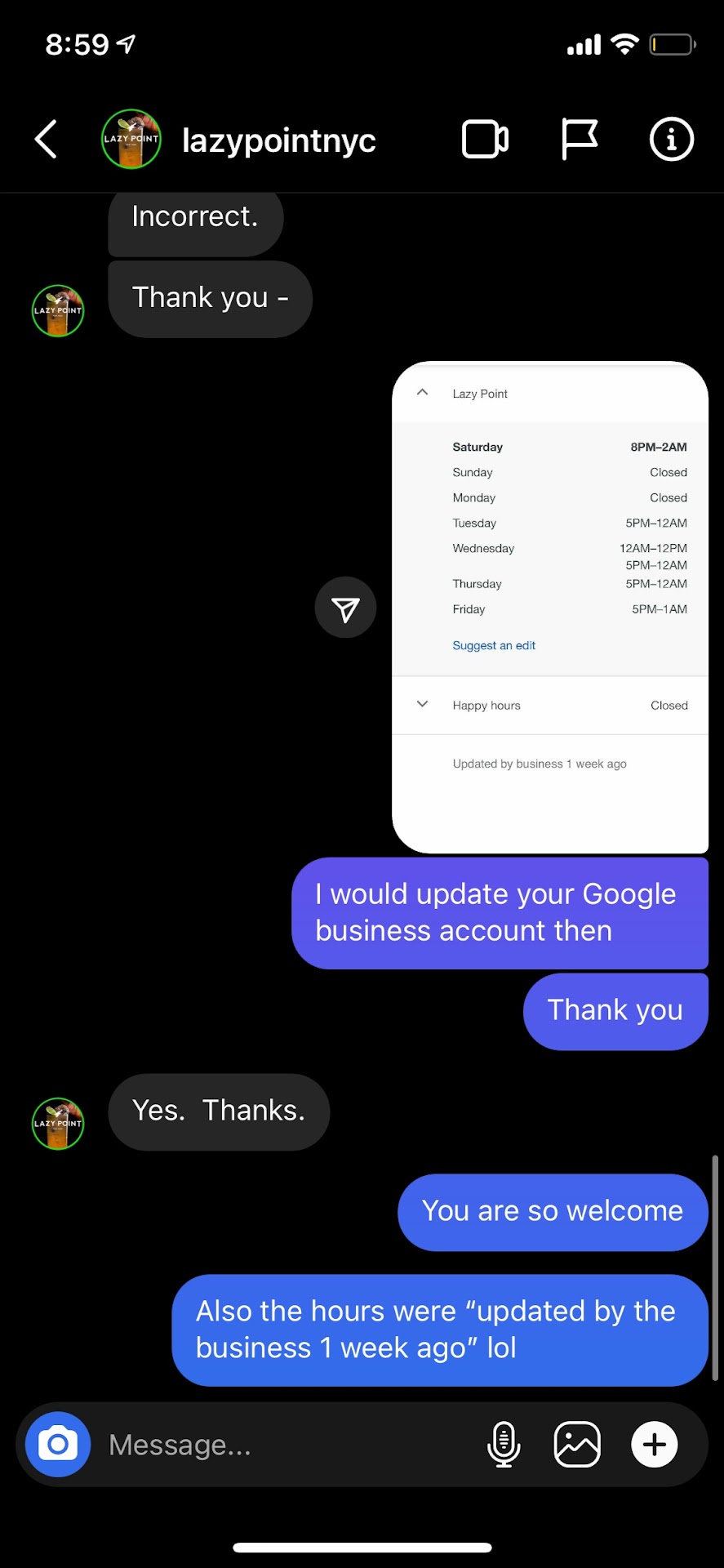 Read moreThe person running the Instagram account needs a reality check. Zero sense when it comes to customer service and how to talk to people who repeatedly give you business. I left my card there last night and sent them a DM to confirm it was in fact there. They confirmed and I asked when I could come back in to pick it up and they said I’m only able to come in Friday/Saturday after 8PM as those are the only times they are open due to “covid.” I don’t live in the city so that’s definitely ridiculous and obviously not possible. They then proceeded to tell me that I was “ incorrect” when I let them know what hours they have listed on their Google business account that was updated ONE week ago by the business as I would have come Tuesday after 5pm. The incorrect and smart aleck thank you was uncalled for. Overall this experience left a really bad taste in my mouth and I will not...