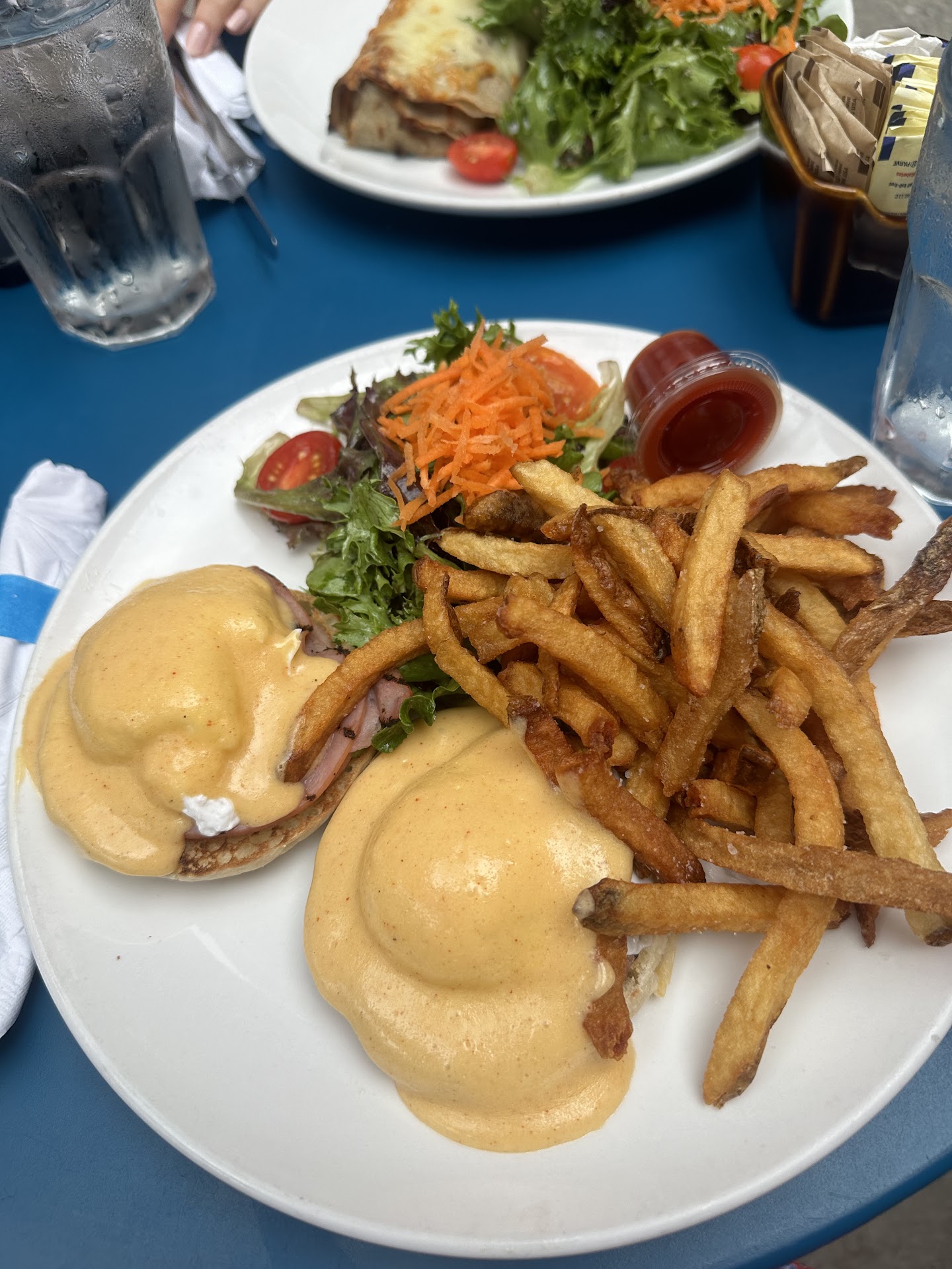Read moreAmbiance (5/5): Lovely little café with indoor and outdoor seating. Some serviced seating as well as order at the front and sit yourself space as well. The bright colors and openness gives the café a lot of charm. There's foreign products along the inside of the store (not sure if they can be purchased). Service (5/5): The staff was super friendly and struck conversations while we dined (not forcefully so). They have regulars with dogs who come to visit and love the staff too. They were quick to attend to us. We would have sat for longer but we were politely told to give up our table at around the hour mark to seat a bigger party :( Food: Eggs Benedict (5/5): The $23 plate came with a nicely dressed salad with veggie variety and well done fries that were cooked with the perfect crunch! The eggs benedict hollandaise sauce was a bit too tart for my preference but otherwise cooked with a perfect runny poached egg. My friend had their crepe that looked pretty good. Definitely will want to return to try the rest...