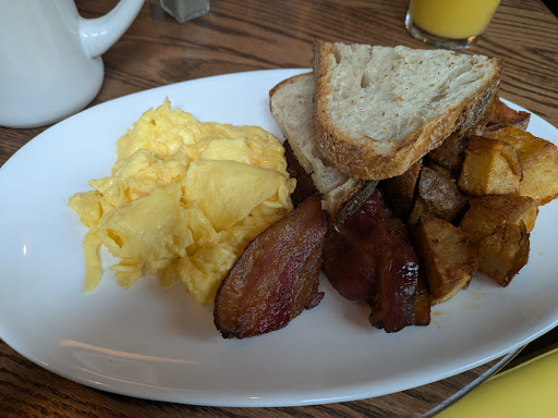 I ordered two scrambled eggs, bacon, potatoes and sourdough toast. It seemed like a standard breakfast. I only wish that it was good. When my food arrived it looked okay but they didn't ask if I wanted anything like ketchup, condiments, sauces or whatever. I had to ask for butter and jam for the toast which was not really toasted. It just was bread. I also asked for some Cholula sauce. First they said they didn't have any and the hostess brought me a miniature dish of Tabasco. When my server asked if everything was okay, I told her the truth that only the bacon and juice were good. She was nice and did find me some Cholula after all.