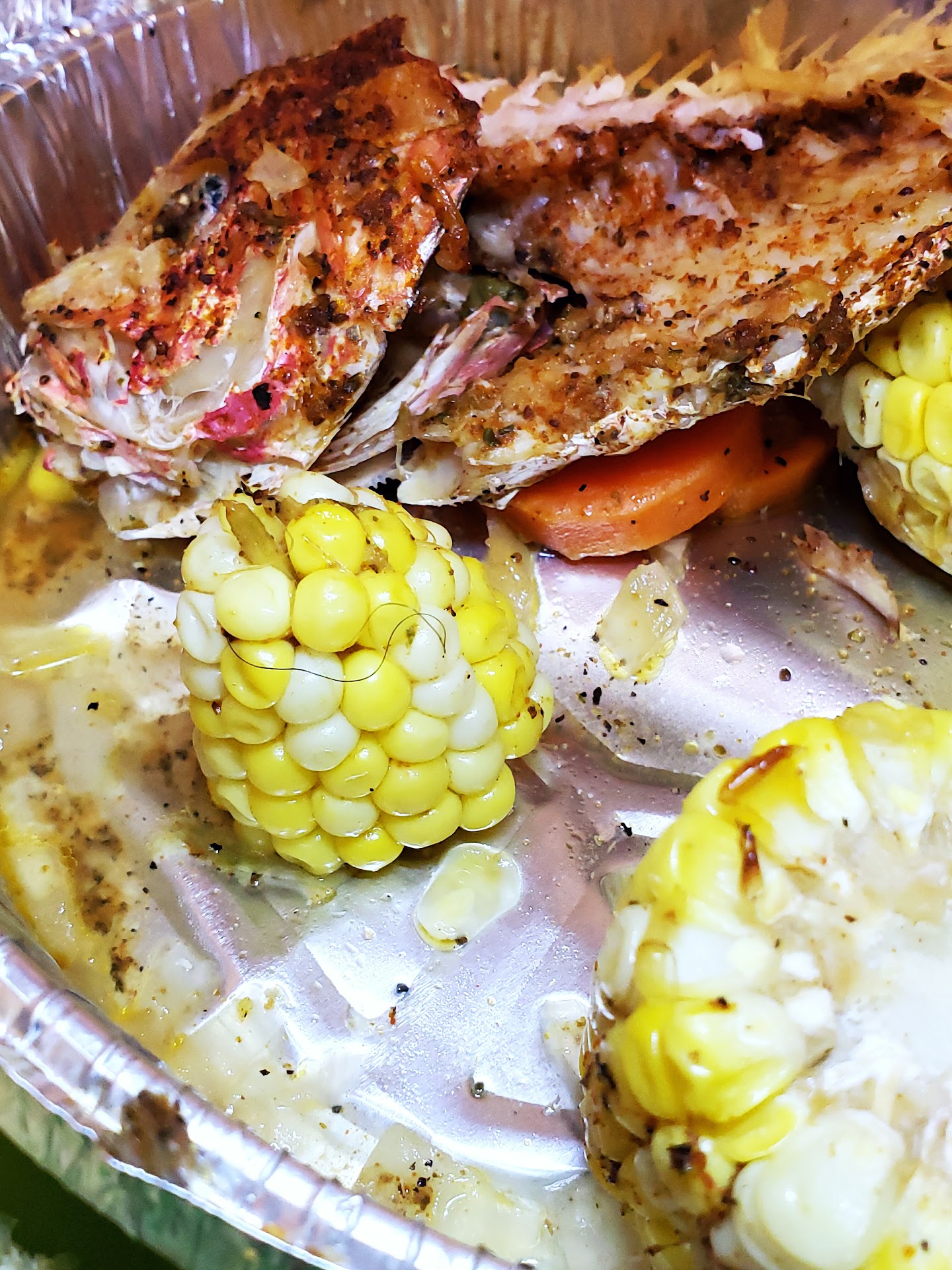 One the first order The delivery person got lost. The fish was great The broccoli and corn was well prepared. The pasta was horrible The okra was oily and bland The Macaroni was ( please see the photo) Fish gets five stars