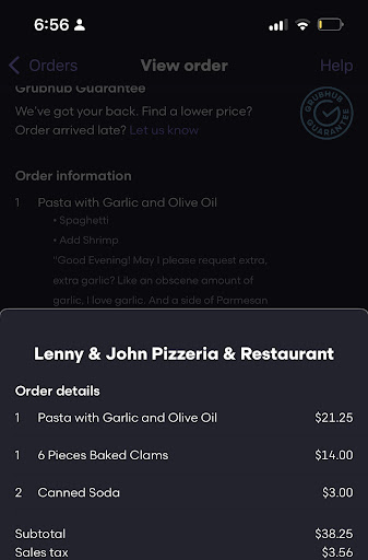 DO NOT ORDER FROM THIS PLACE. Three years later, and their customer service is still terrible. I ordered via Grubhub: spaghetti with garlic and olive oil ($11.50), added shrimp ($9.75), baked clams ($14), and two Cokes. After confirmation, I realized they use their own drivers—something you don’t see before ordering—so I called at 6:39pm and politely asked the driver to call me when arriving. Daniel, who answered, was kind and said okay.