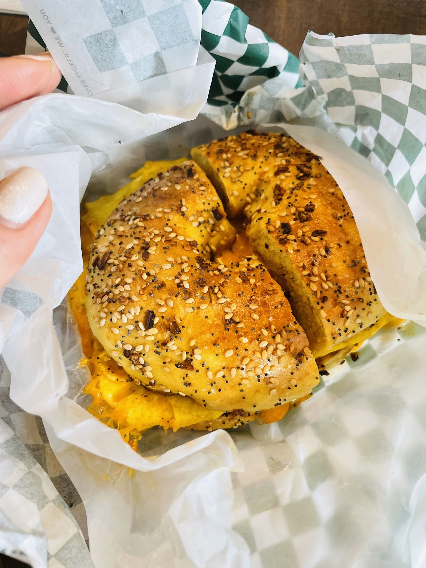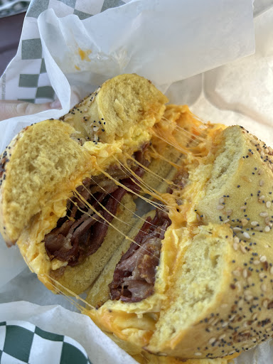 Food: We ordered an egg everything bagel sandwich (with cheddar, eggs, and sausage) and the same thing on the whole wheat everything. Omg talk about humongous portions! I'm not used to un-shrinkflationed food! You could easily split a bagel sandwich if you're not too hungry. The bagel itself was extremely good. It's not the type that is only good if you heat it up. Even when the sandwich cooled off, it was definitely the most moist, yummy whole wheat bagel I've ever had. The sandwich itself was extremely hot, which made the cheddar (that's some high quality cheddar there) super gooey and hot. It was DELICIOUS. You have to try it!