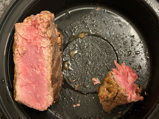 Adding a picture of the 'medium' steak that was taken home in a doggy bag. It was too dark to get a good photo in the restaurant, but you can see here just how undercooked it was. It was so tough, even the dog struggled to get it chewed up. Not sure how a steak house could fail so badly on both steaks served to a table, but for $50 a plate....I expect...