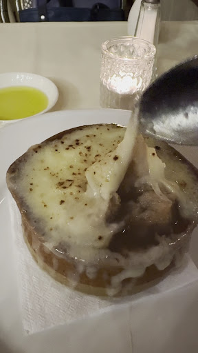 The French onion soup was very delicious. The sweetness from the caramelized onions and the savory flavor from the broth. The bread was soaked with broth and covered with cheese. It was simply delicious.
