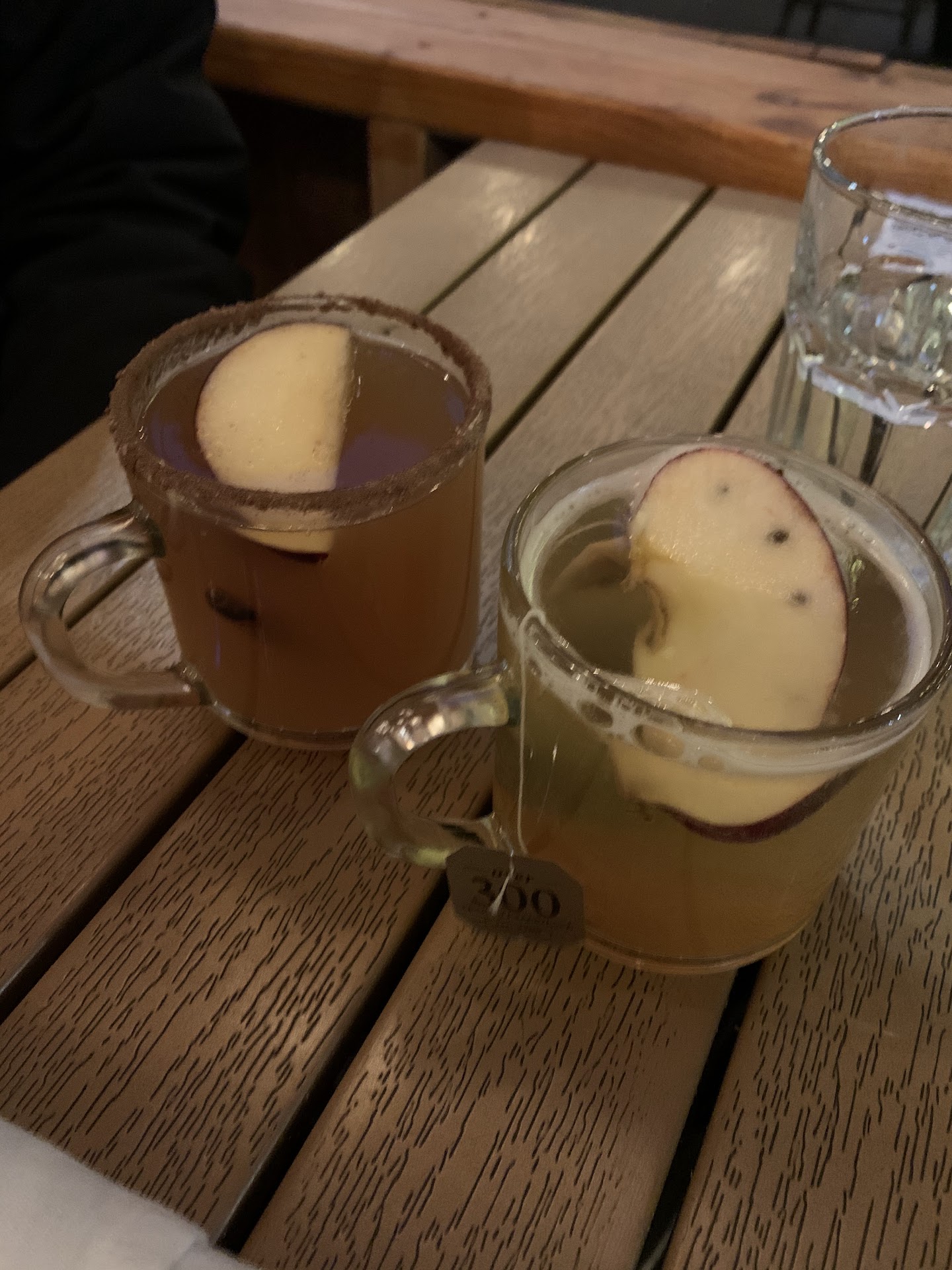 We ended up trying the spiked apple cider, spiced apple hot toddy, apple cider mule and the mulled wine. The drinks were fine, nothing too crazy - if you arenât sure about the spiked apple cider vs hot toddy, definitely get the cider! The hot toddy was interesting to try but not my favorite. I wouldâve loved to have tried other cocktails, but it was so cold the day we visited that we stuck with the hot cocktails.