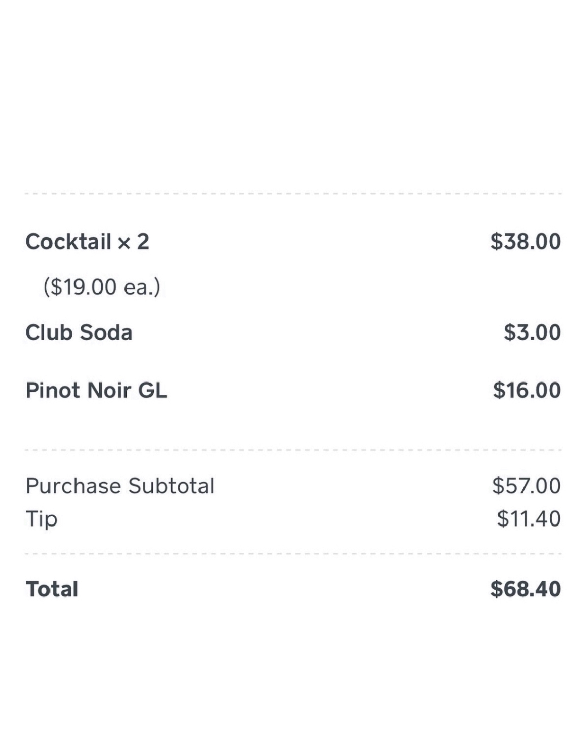 When we paid, server showed up without presenting an itemized receipt and just announced total. I was already so fed up, I just paid. Got a notification with a receipt on my phone. What do you think? He charged me for a club soda! I didn’t need your club soda! I need my drink to be made right!
