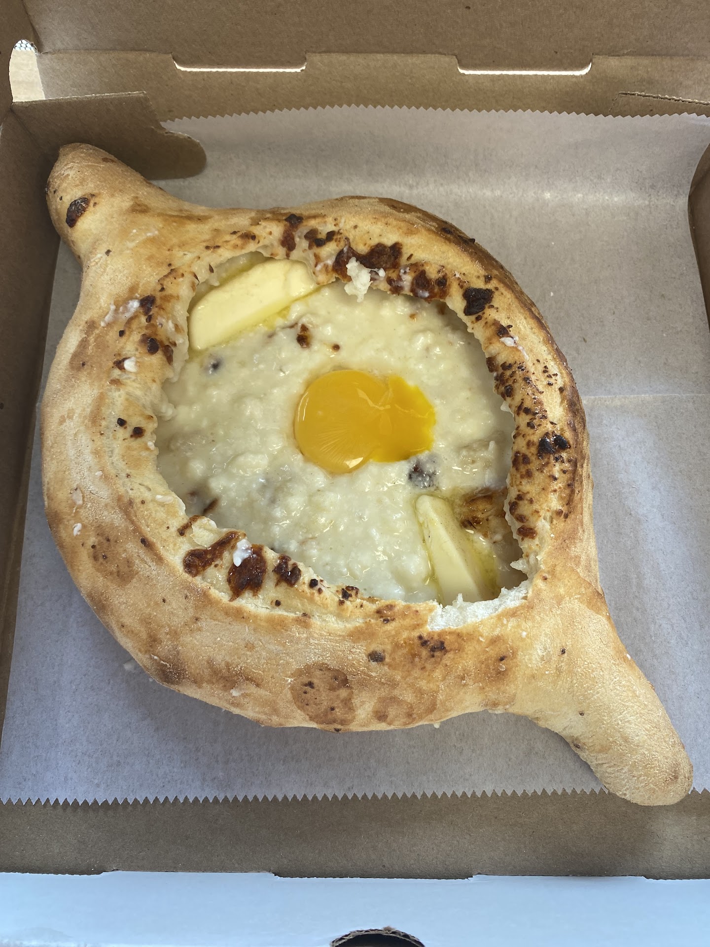 The adjaruli shaped like a boat filled with sulguni cheese, is topped with butter, and egg was ridiculously good! It comes from the coastal region of Adjara in Georgia