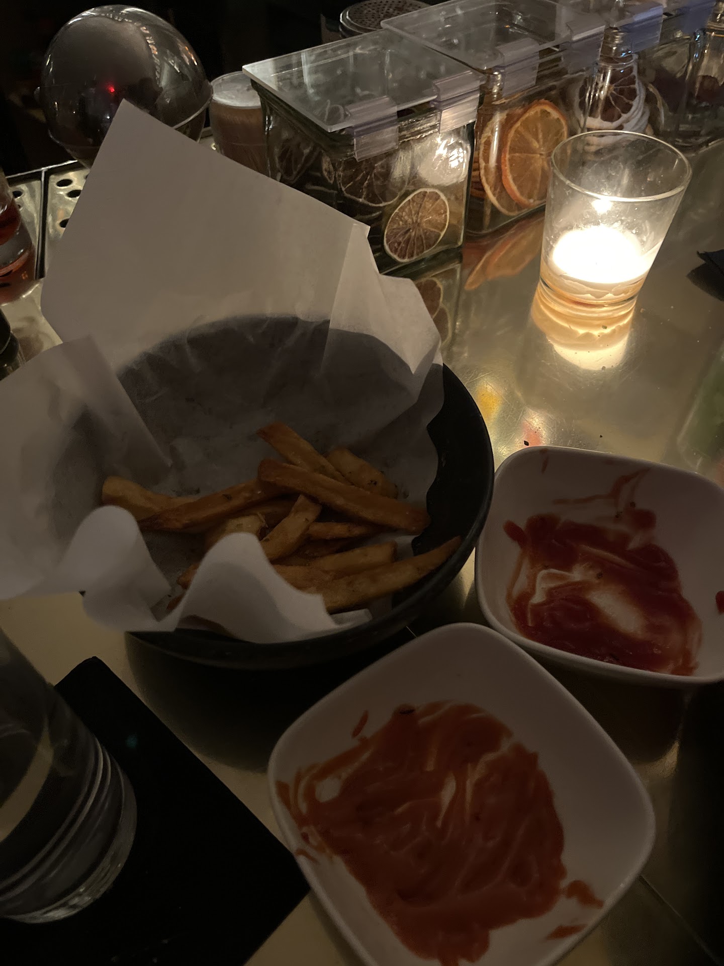 Now, the fries - a heaping portion of steak cut fried drizzled in a thyme truffle salt. A good portion for the price ($10) but quality, a little lacking. Photo 1 is the mid fries. I would say: fry them longer! Or cut them thinner! But the drinks on the other hand - worth the price but try something traditional first I would say itās on the cheaper end $18, my husband and I ordered fries and two cocktails came up to $50 (pricey but hey itās New York and this a fancy place!) I would say for what is being presented - just do a little better...