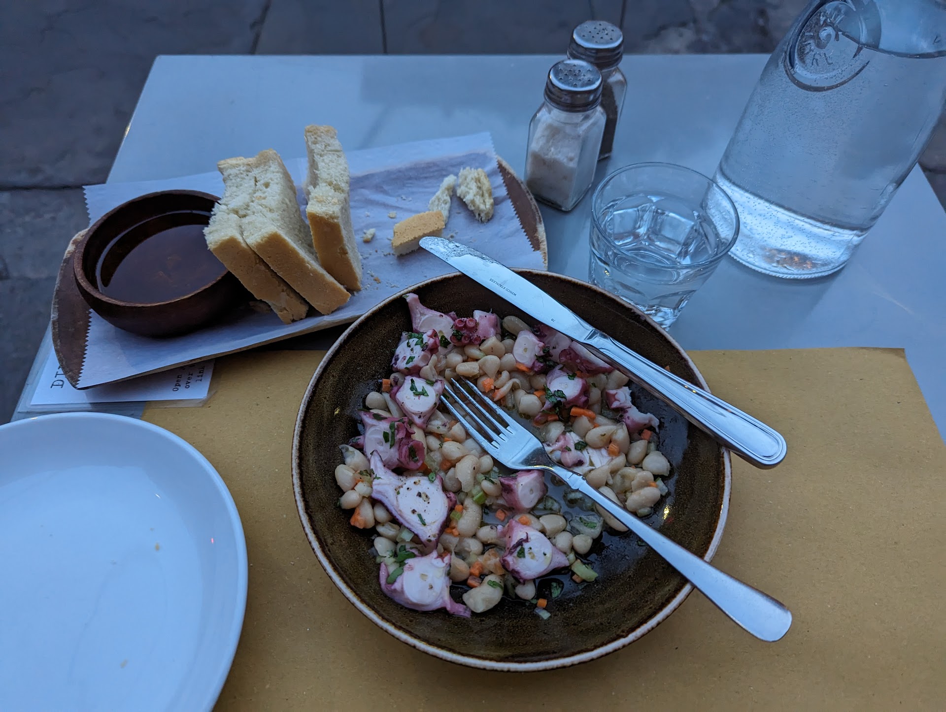 Read moreOkay let's be as objective as possible here. I walked in by myself for a 8PM reservation. I first ordered the 28 dollar octopus appetizer. Some pieces were very chewy and others were soft. Overall not much flavor going on other than a mild "tuna-can' taste. The white beans were undercooked, so when you bite into it, you can taste graininess to them (that really sucked). I took 2 small bites and left the rest untouched. The bread was super dry (actually just sad) and the olive oil was just okay. It didn't really have that nice EVOO smell and taste you look for a good dipping EVOO.