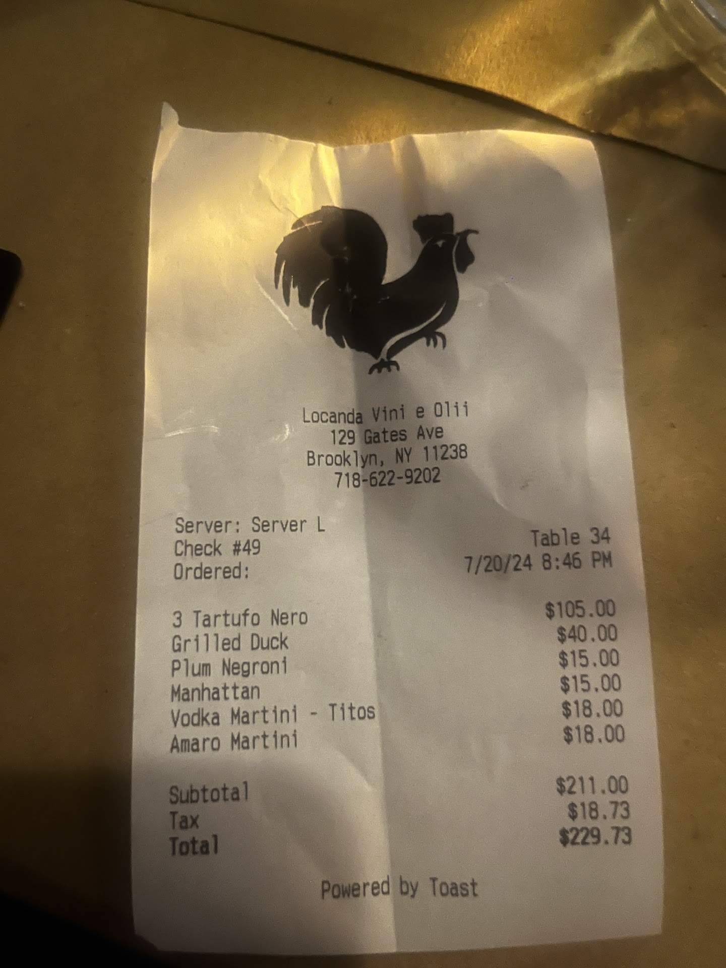 I recently had the opportunity to dine at Locanda Vini & Olii, and while I had a fantastic experience with the majority of the staff, I was disappointed by the behavior of the owner.