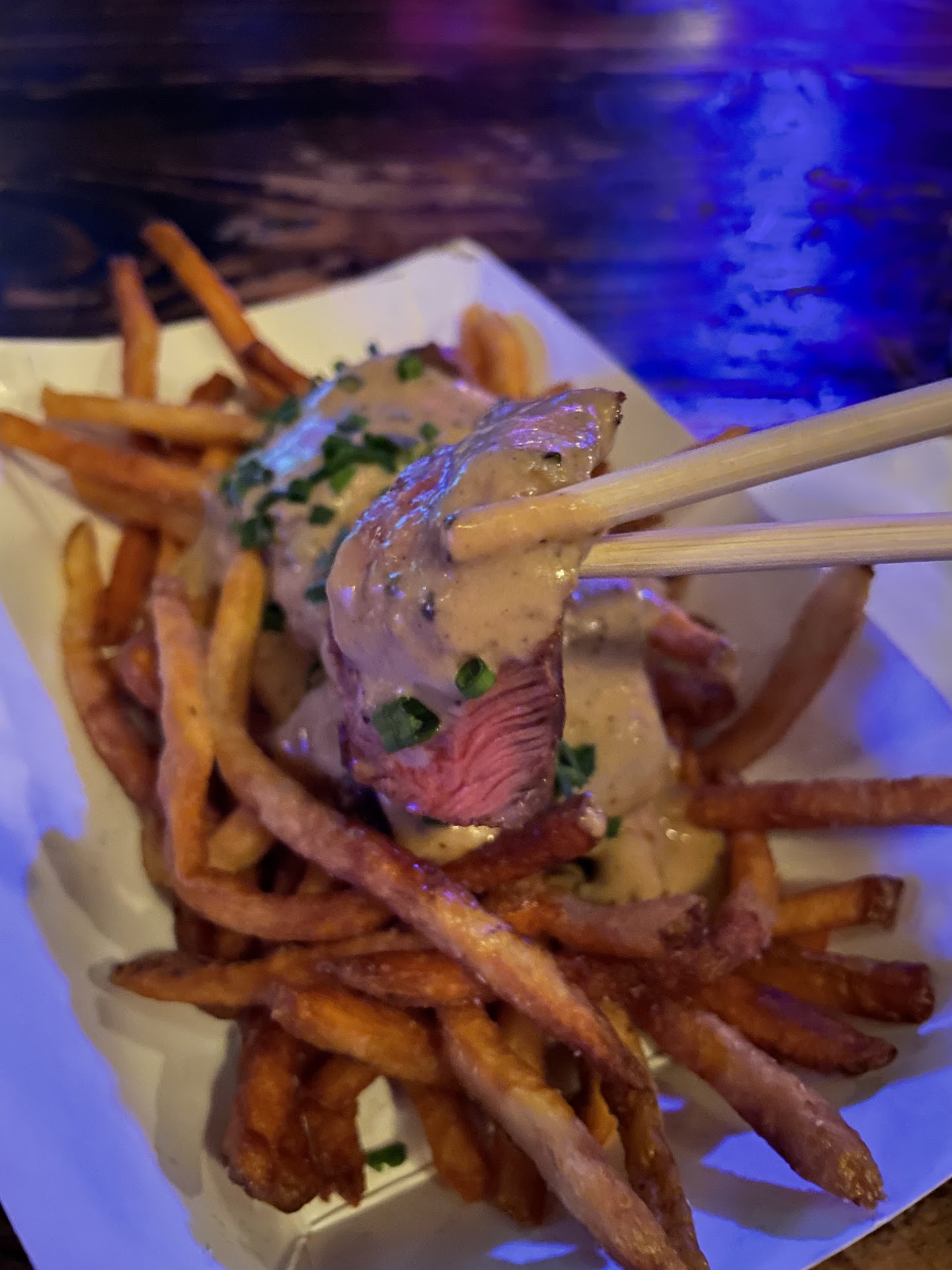 Omg it was so loud! Like, canât hear yourself loud. The bartenders were so nice, but I would have just loved the place so much more if they lowered the music 3-5 notches since itâs not 10pm. I ordered the Steak Frites Mala Au Poivre & 1 Cucumber Mint Gimlet. It took about 20 minutes or so with maybe 3-4 people there. So it felt a little long for me for medium rare. The steak was smothered in sauce, so it was a bit hard for me to taste the steak. I did like it with the fries but not sure if the dish is right for me. Also I wasnât expecting to pay almost $50 for a meal and a drink in Bushwick. I do feel like Iâve aged out of a place like this so not sure if this is the place for me. I did see when I left, they were offering earplugs in the front. So everyone is aware itâs loud. But a little confused why they donât just lower the volume. The food was good, just not sure if itâs worth the...